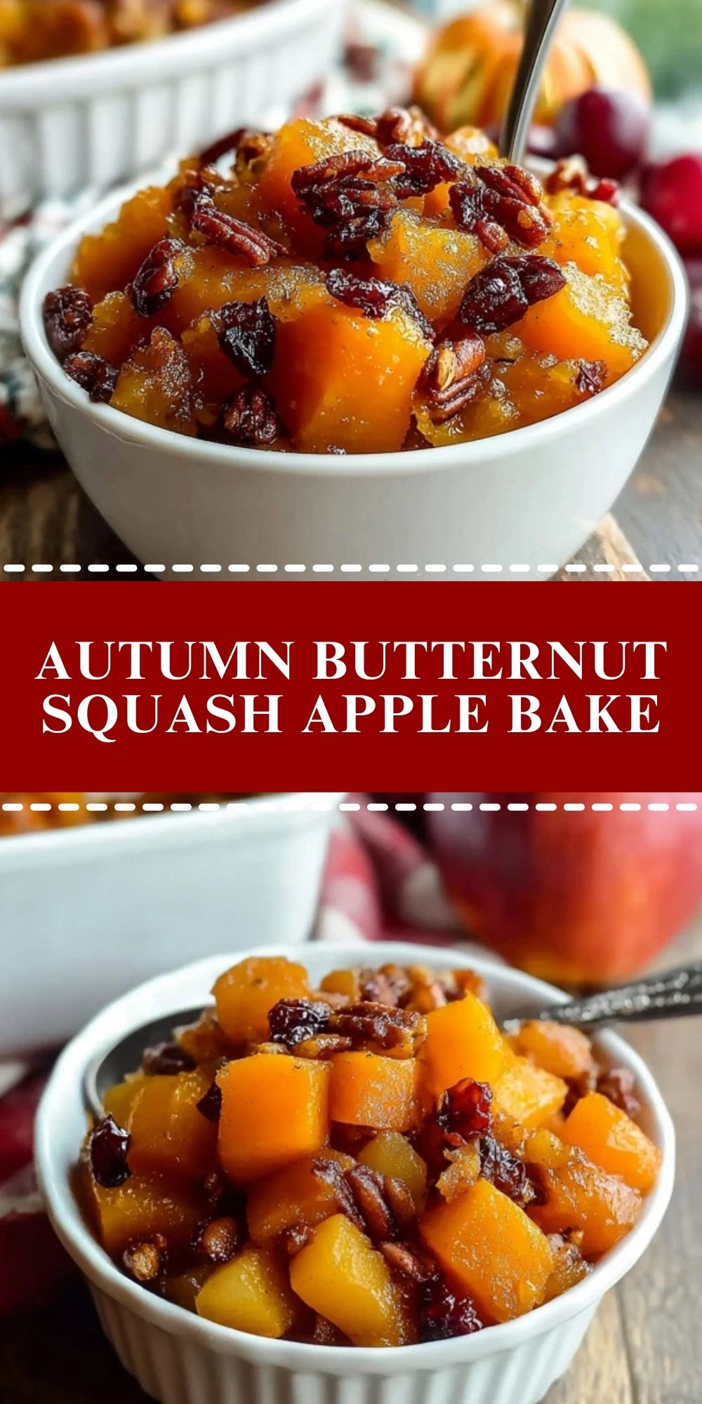 This cozy Autumn Butternut Squash Apple Bake is the perfect seasonal side dish. Tender roasted squash and apples come together with warm spices, maple syrup, toasted pecans, and tart cranberries for a comforting, crowd-pleasing bake.