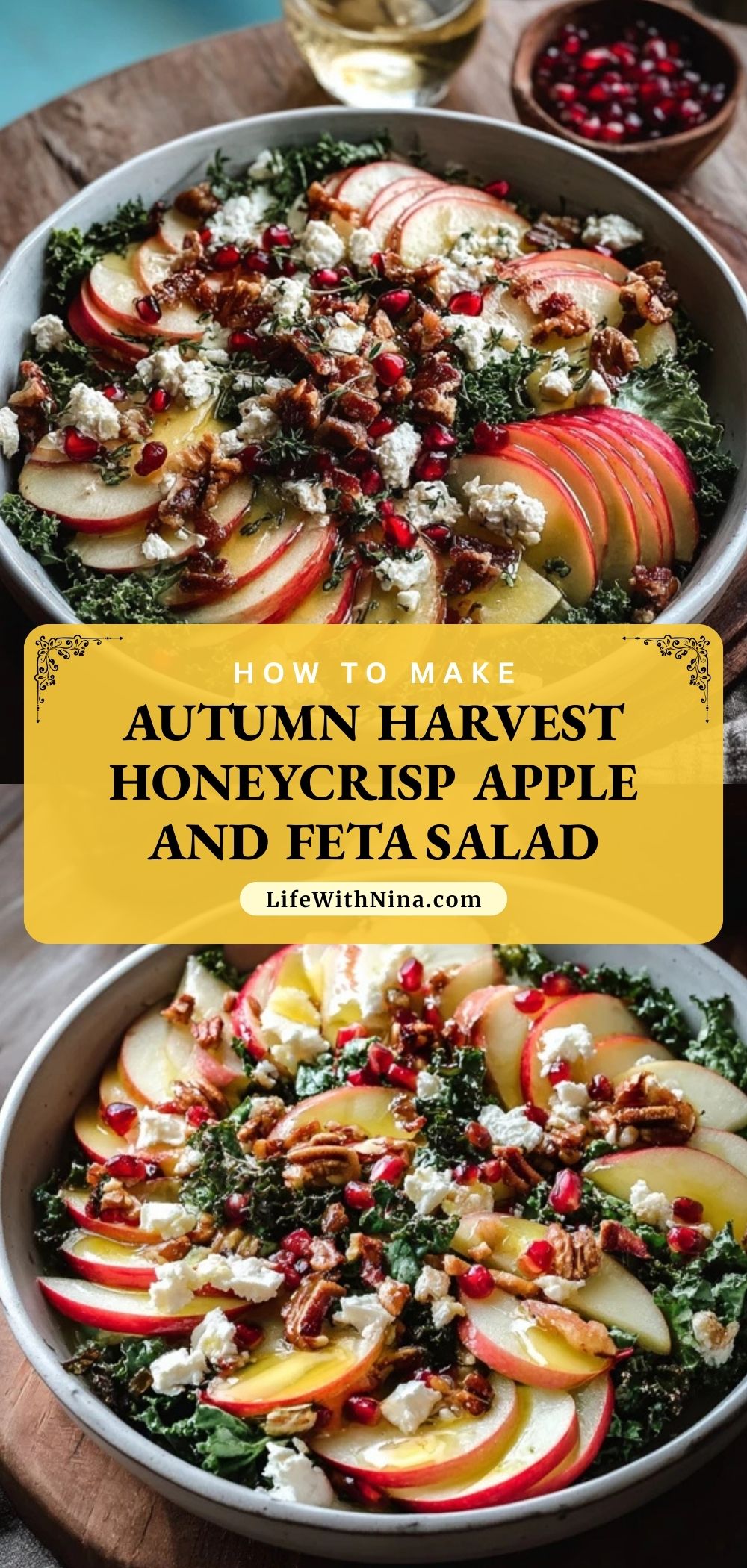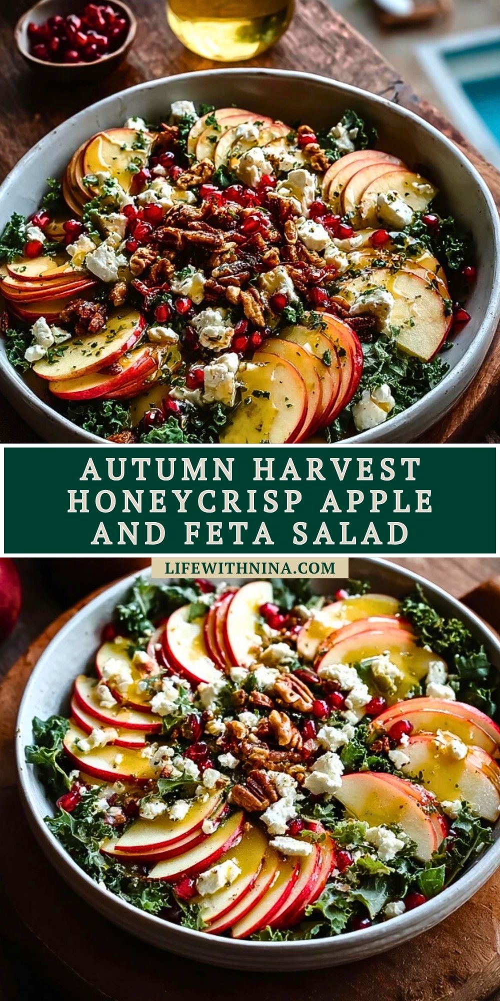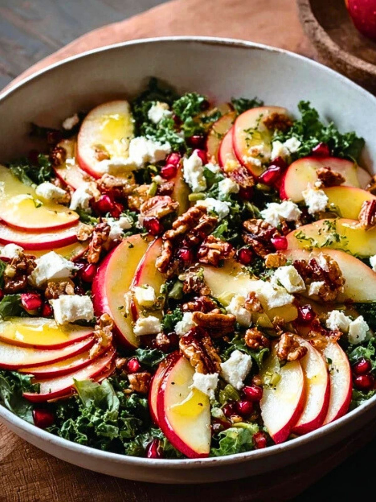 A vibrant, crisp, and colorful fall salad featuring sweet Honeycrisp apples, creamy feta, candied pecans, and juicy pomegranate arils over tender kale, all tossed in a tangy apple cider vinaigrette. Perfect for holiday spreads, healthy lunches, or light dinners.