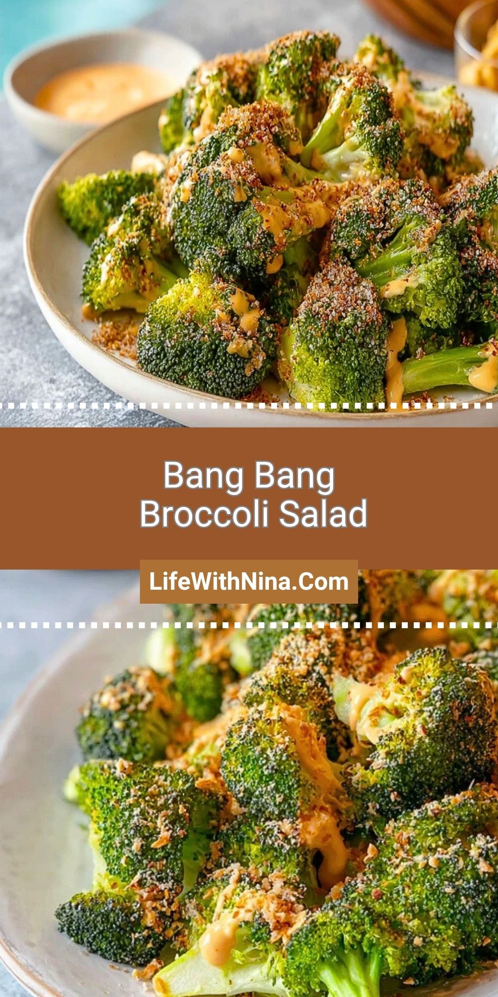 7. Once broccoli is done, place on a serving dish. Drizzle with bang bang sauce and sprinkle with the toasted topping. Serve immediately or at room temperature.