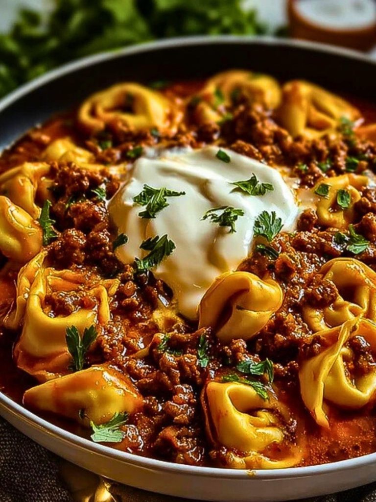 When Tex-Mex comfort food meets cheesy Italian pasta, something magical happens—and this Beef Enchilada Tortellini is proof. Picture pillowy cheese tortellini tossed in a bold enchilada-style sauce, with perfectly seasoned ground beef and creamy sour cream swirled on top. It’s the kind of cozy, flavor-packed skillet dinner that comes together quickly but tastes like you simmered it for hours.
