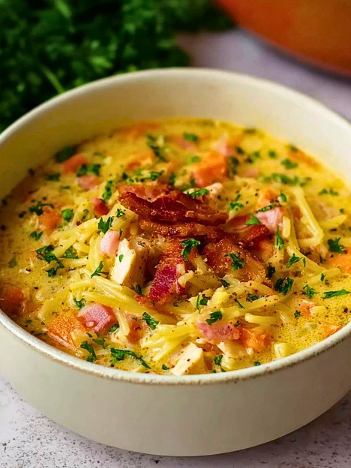 Ladle the soup into bowls and top with crispy bacon and fresh parsley. Serve hot while the cheese is melty and the broth is silky.