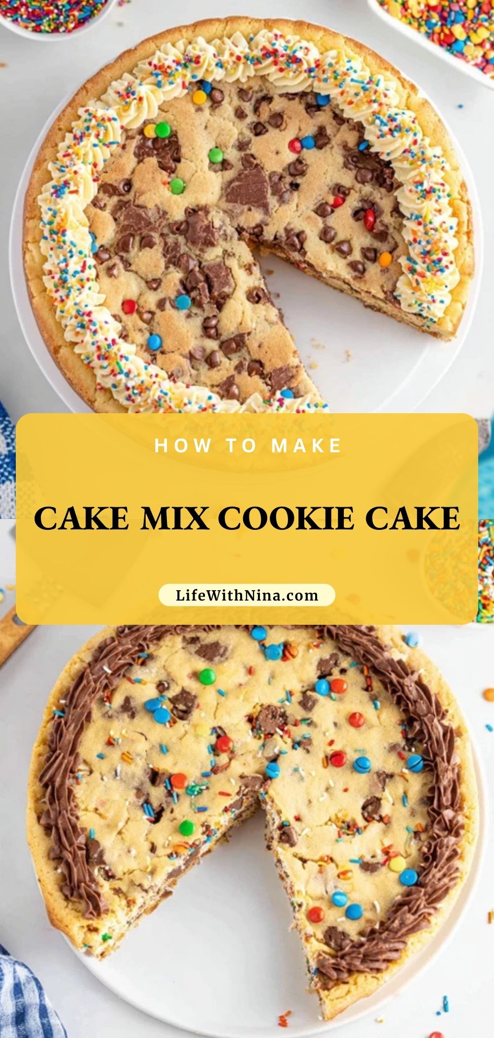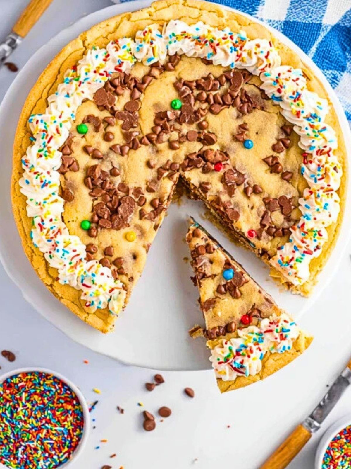 Allow the cookie cake to cool in the pan for about 10 minutes, then transfer to a wire rack to cool completely. Once cooled, pipe frosting along the edges and add sprinkles for a festive look.