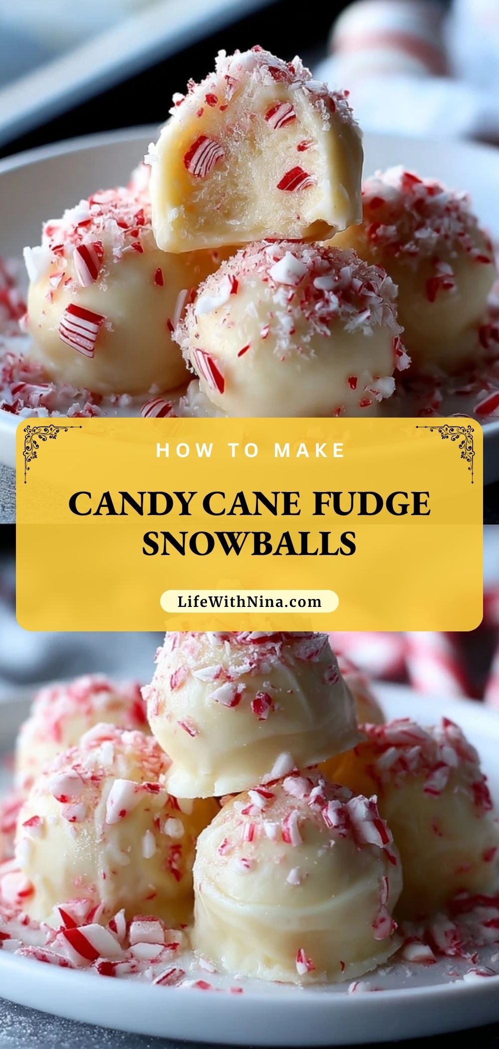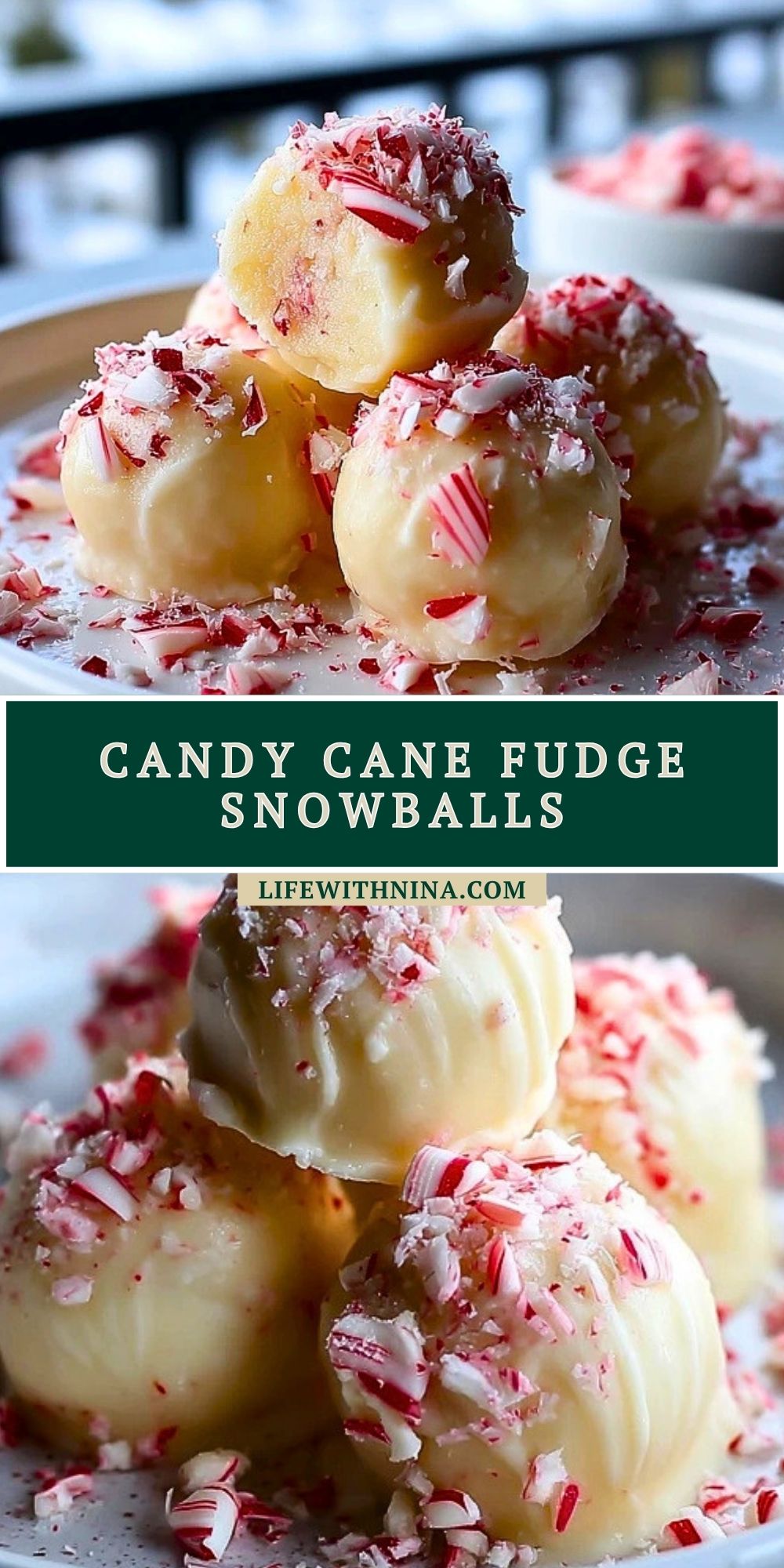 Keywords: candy cane fudge snowballs, holiday dessert, Christmas candy, no bake dessert, white chocolate peppermint treats, easy recipe, holiday food ideas, party treats