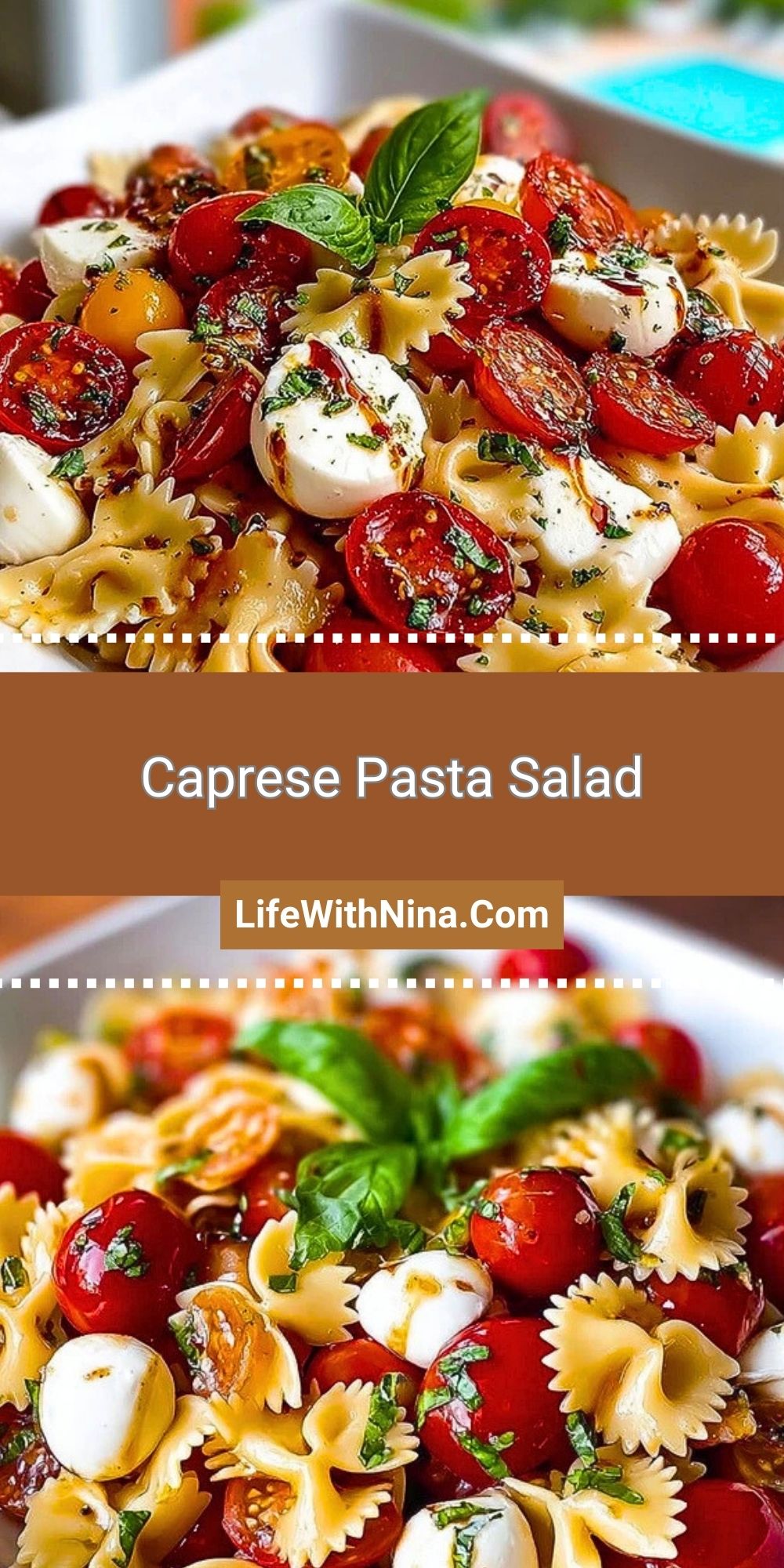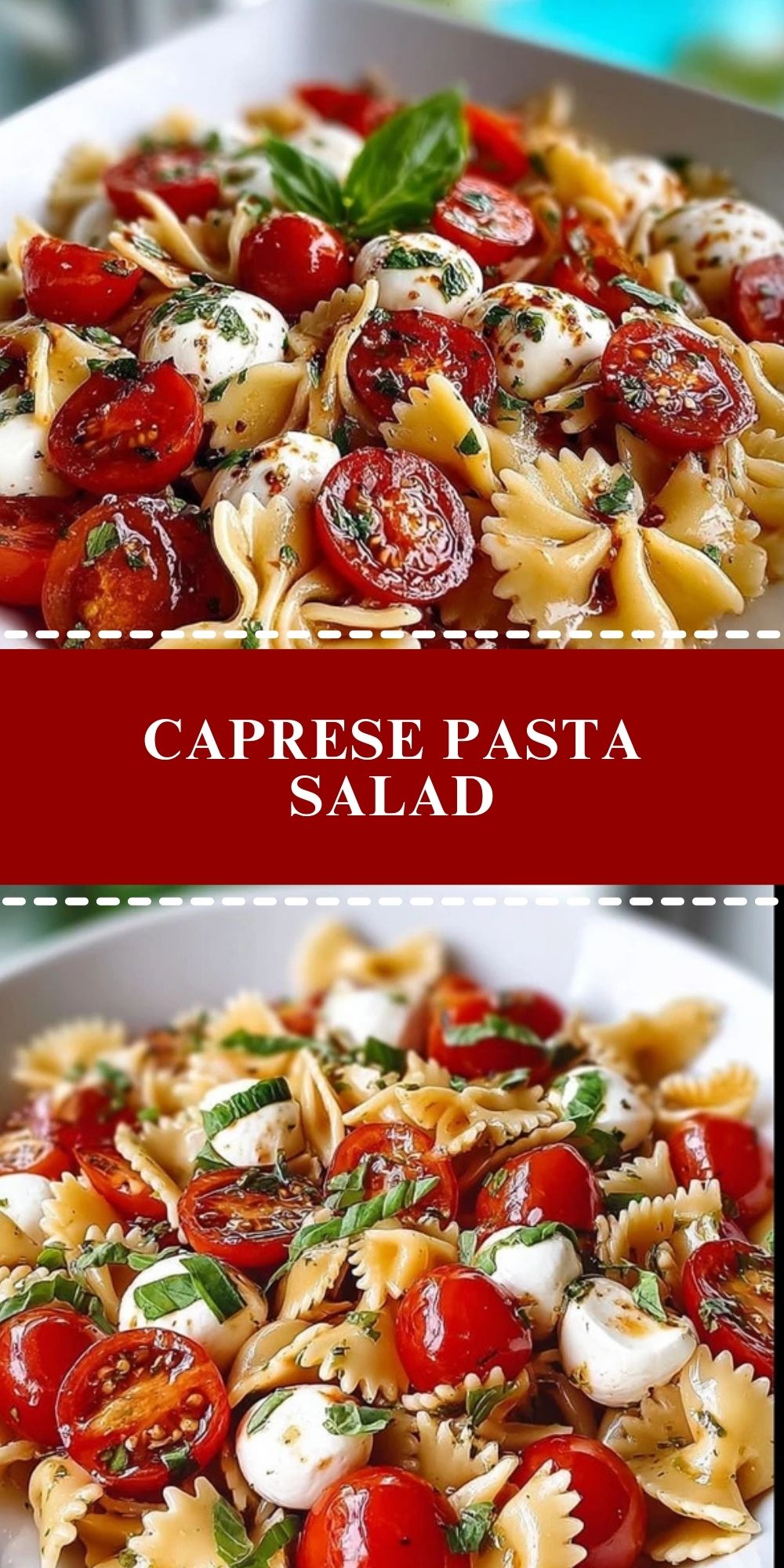 The juicy sweetness of cherry tomatoes, the richness of mozzarella pearls, and the brightness of basil make this dish a celebration of fresh, simple ingredients. Farfalle pasta (also known as bowtie) gives it a satisfying texture and a pretty presentation, while balsamic glaze ties everything together with a sweet and savory punch.