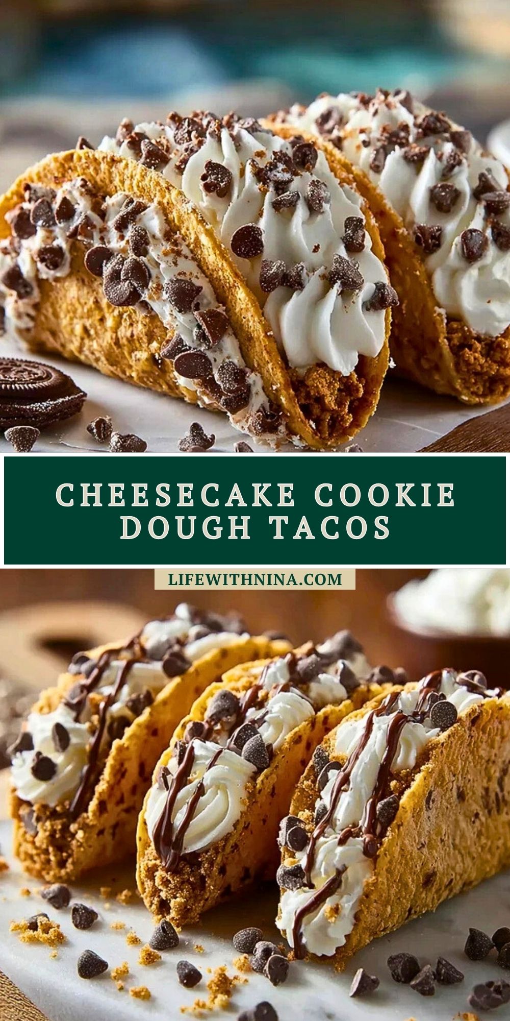 Crispy taco shells dusted with graham cracker crumbs, filled with a light and creamy cheesecake mousse, and topped with chunks of edible cookie dough and mini chocolate chips—these Cheesecake Cookie Dough Tacos are a showstopping dessert mashup. Fun to make, beautiful to serve, and irresistibly good in every bite!