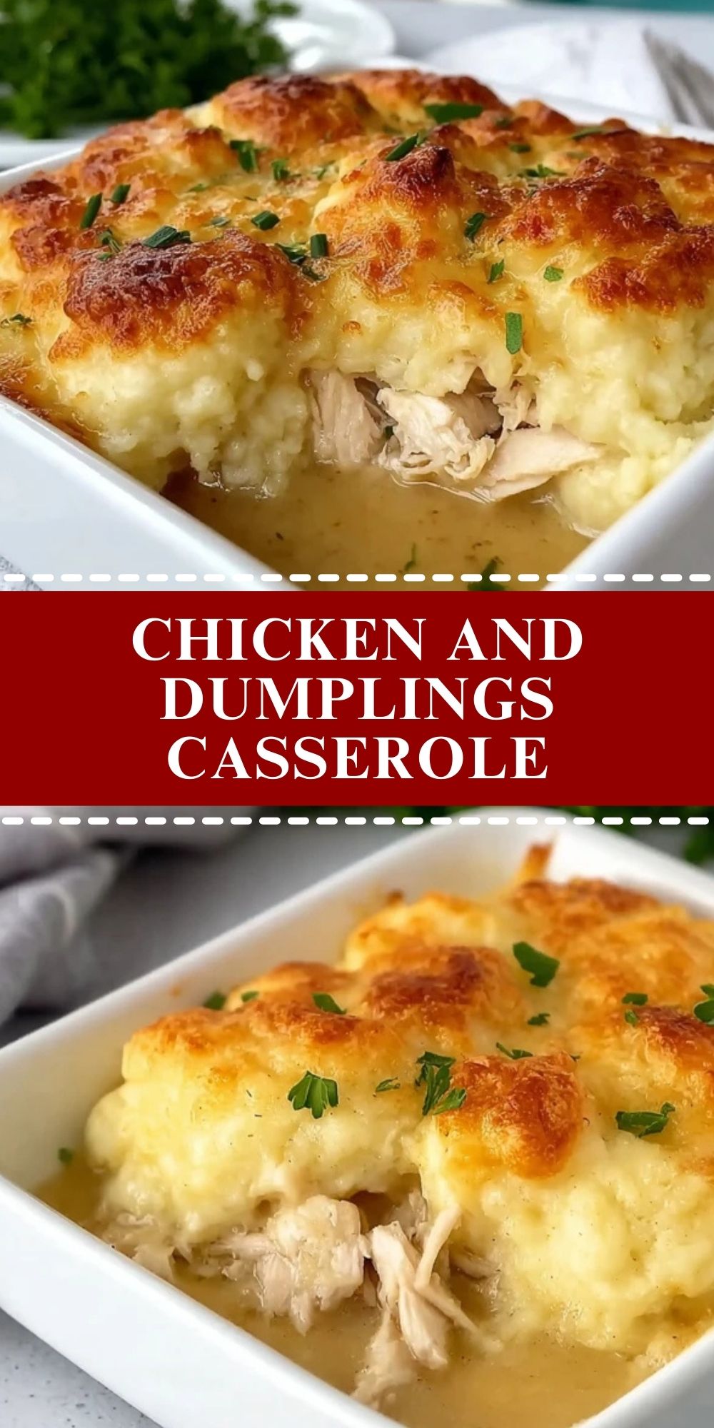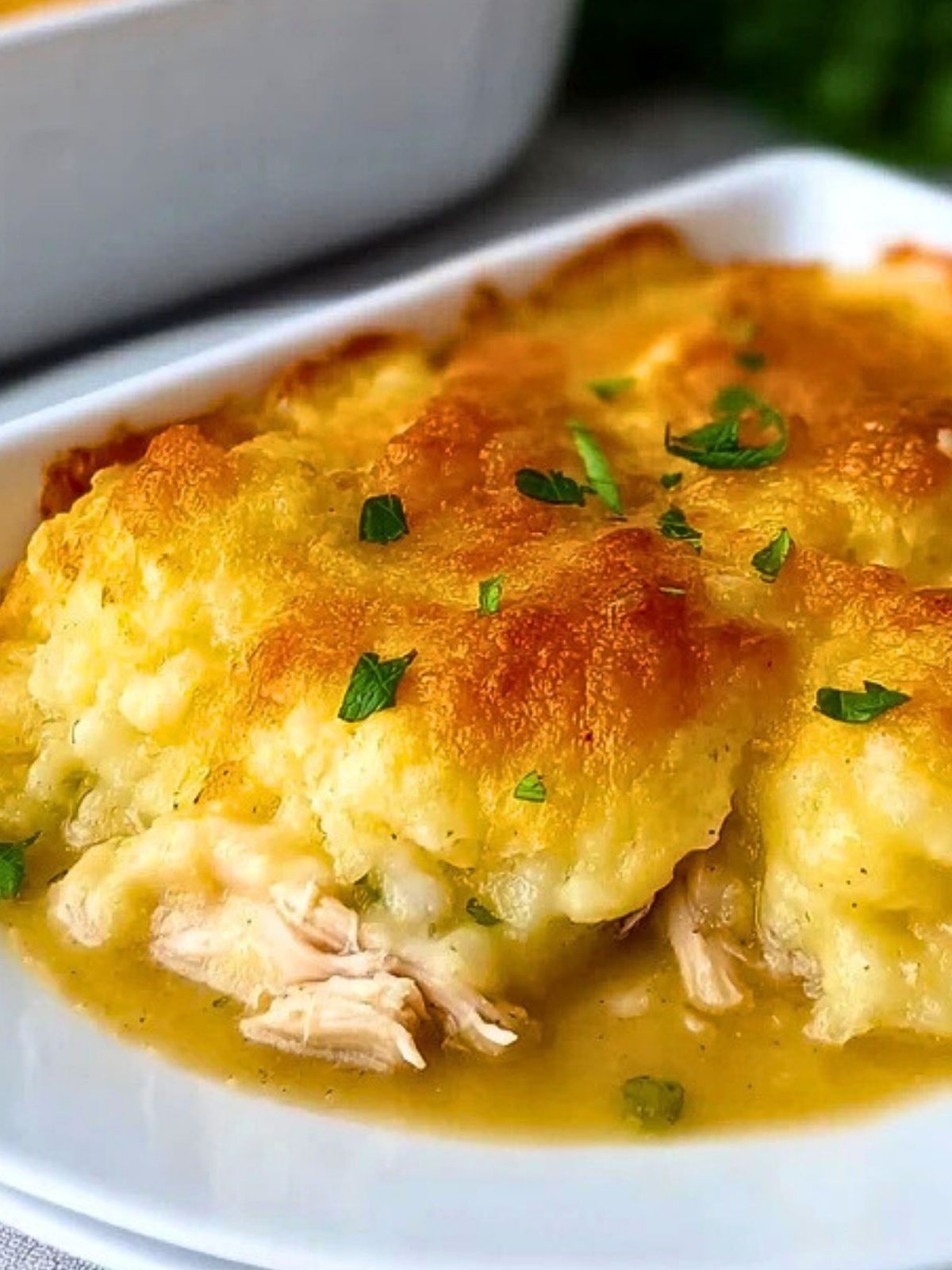 This Chicken and Dumplings Casserole is the ultimate cozy comfort food — tender shredded chicken layered with peas, topped with a soft, fluffy dumpling crust and baked to golden perfection. No rolling or simmering required — everything bakes in one dish, making it an easy and satisfying meal for weeknights or weekends.