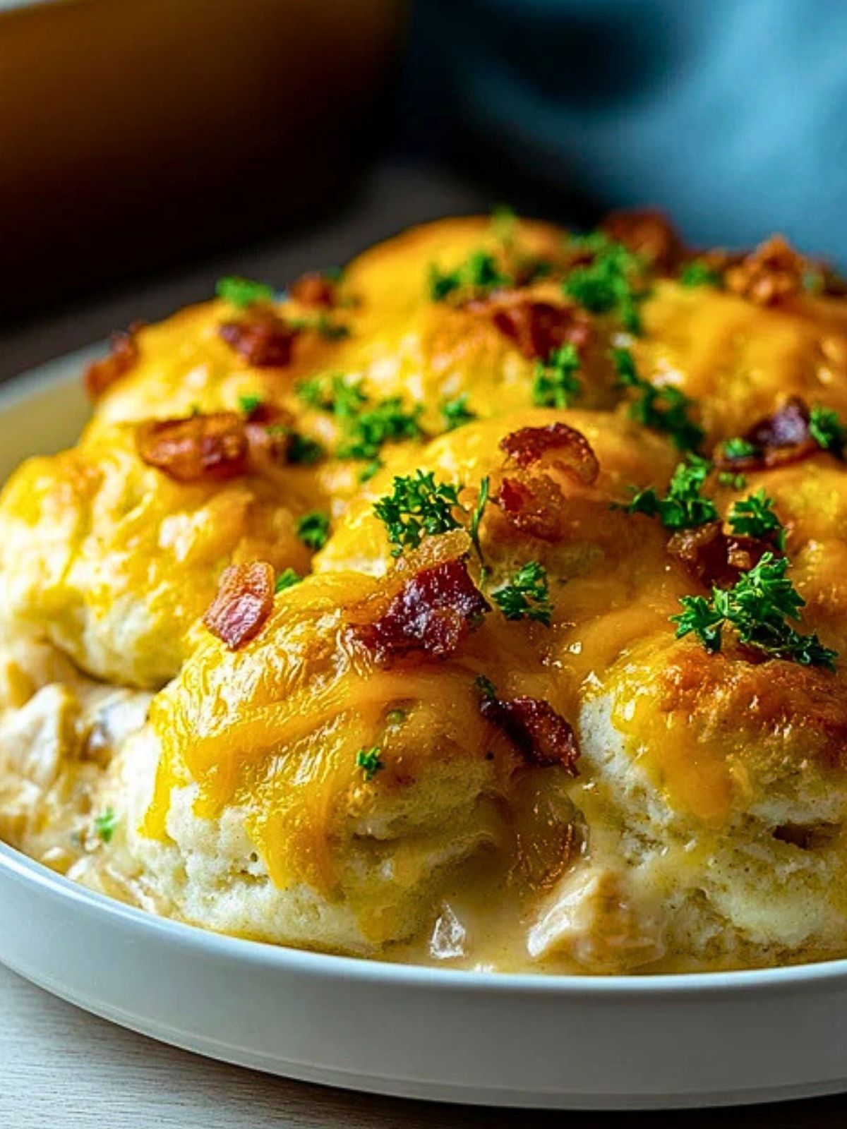 This dish is best served warm from the oven when the biscuits are fluffy and the cheese is still melty. Pair it with a simple green salad or roasted veggies for a complete meal.