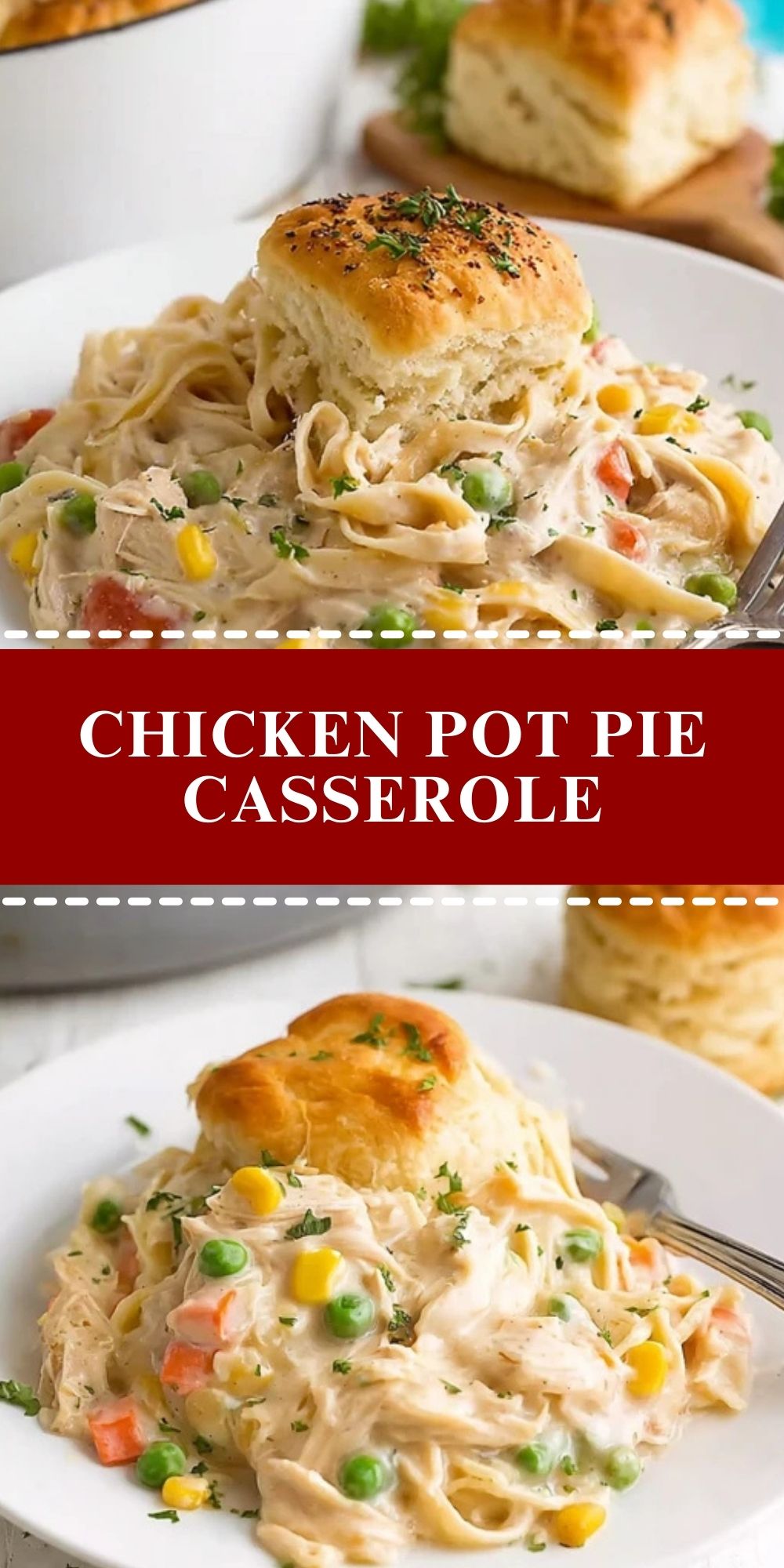 This Chicken Pot Pie Casserole is everything you love about traditional pot pie, made even easier in a comforting, crowd-pleasing bake. Creamy chicken and veggie filling gets tucked beneath golden flaky biscuits for a cozy one-dish meal that’s weeknight-friendly and perfect for sharing.