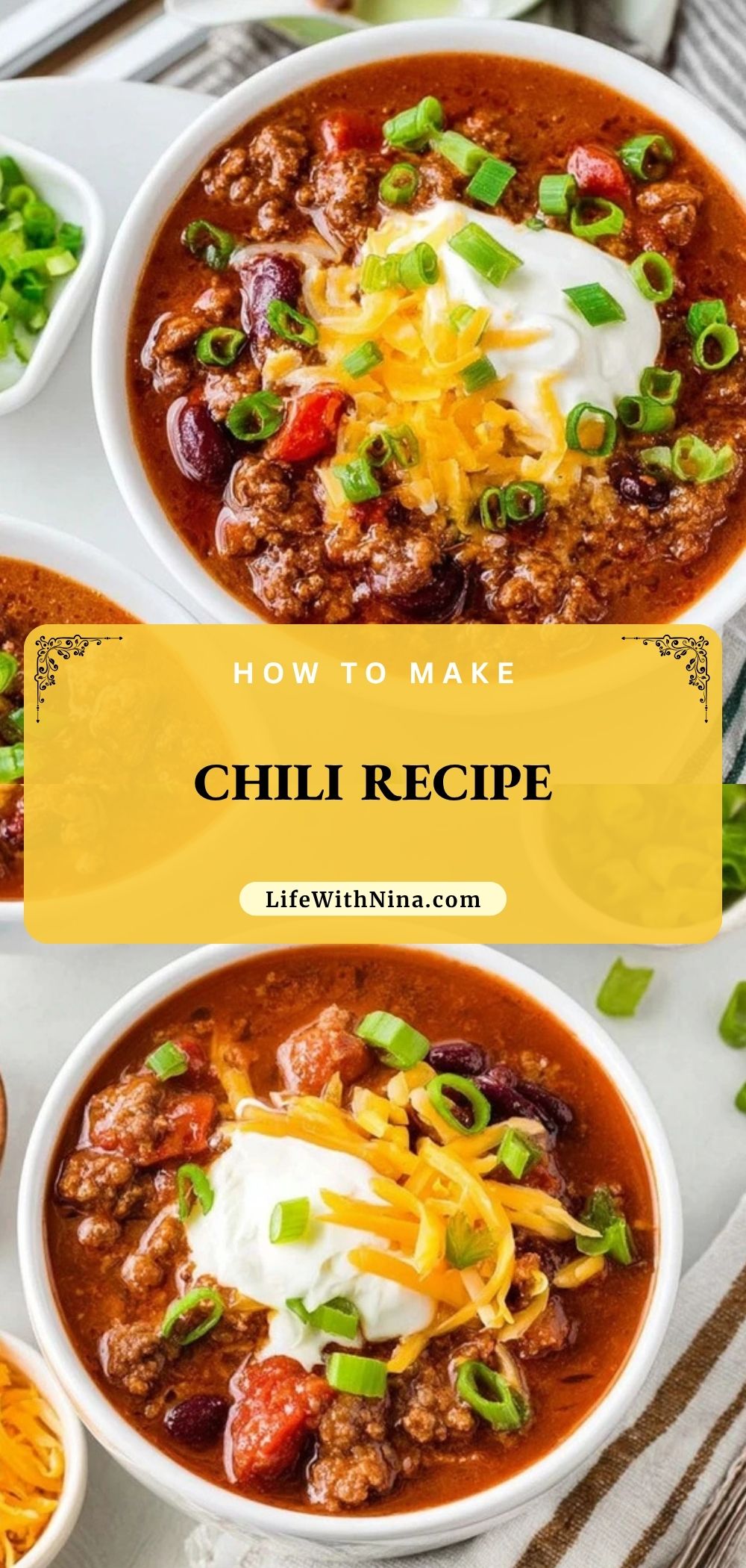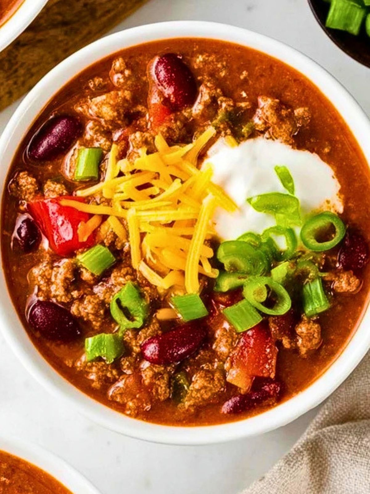 There is something so comforting about a warm bowl of chili simmered until rich, hearty, and full of bold flavor. This chili recipe brings together seasoned ground beef, tender beans, tomatoes, peppers, and spices in one cozy pot that tastes even better as it sits.