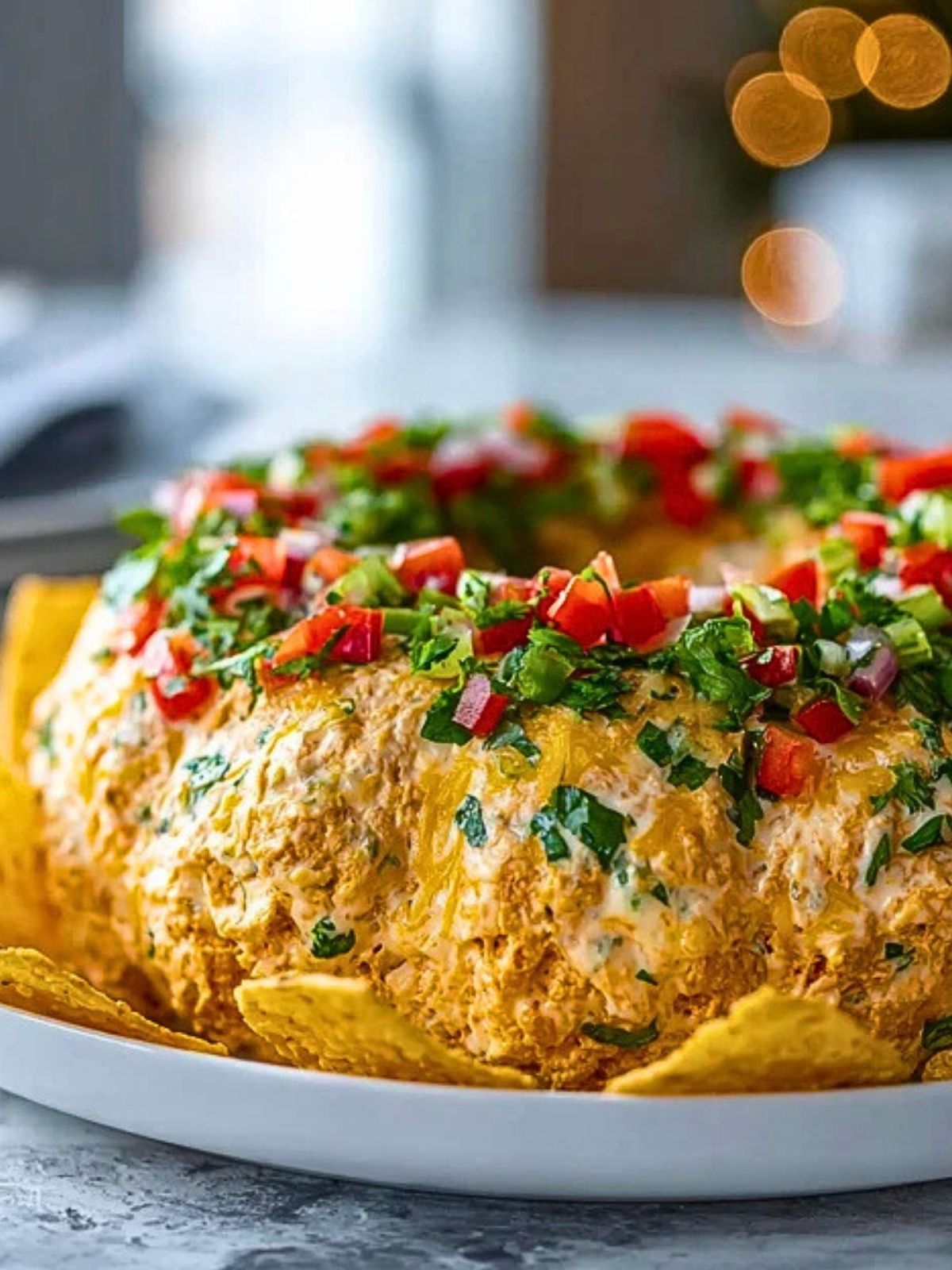 Think of this dish as your go-to solution for a low-effort, high-impact holiday appetizer. It brings together the zesty comfort of tacos with the convenience of a make-ahead cheese ball. Surrounded by crispy tortilla chips and topped with fresh tomatoes, scallions, and cilantro, it’s a joyful blend of color, texture, and taste.