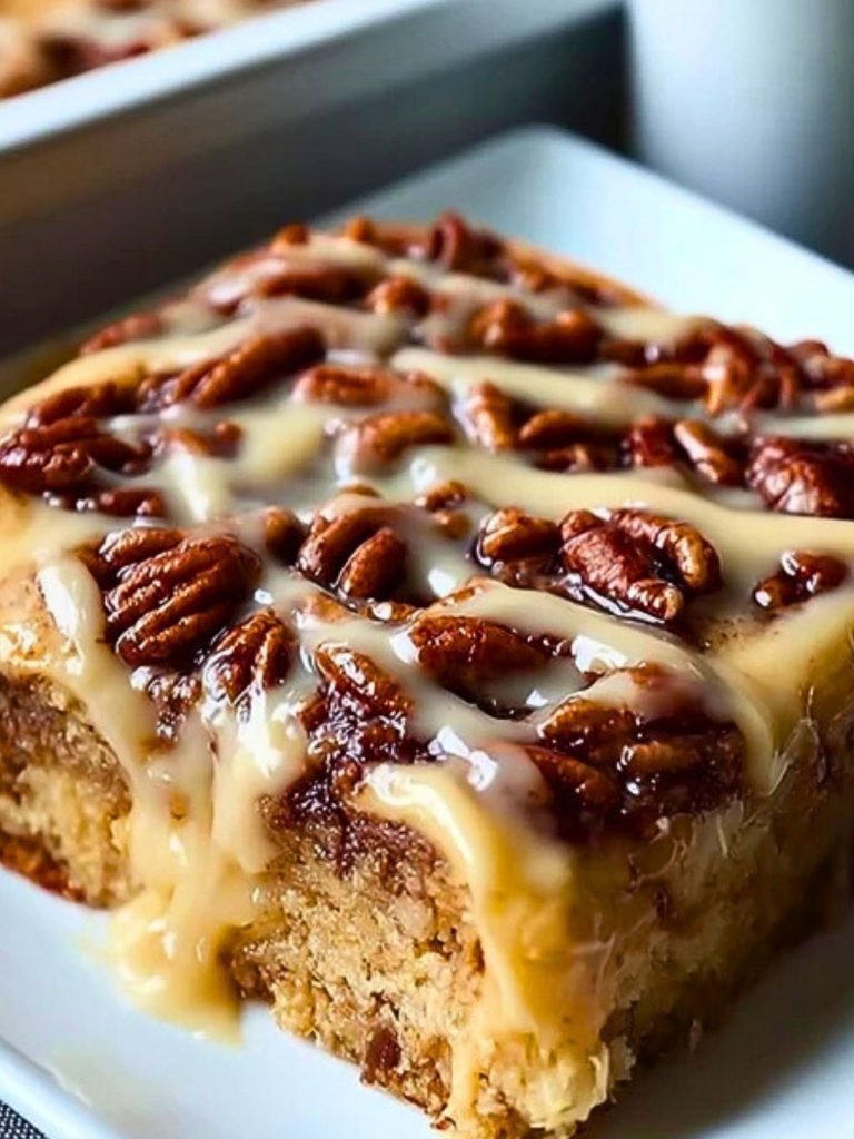 Once the cake is out of the oven and slightly cooled, drizzle the glaze generously over the top. Let it soak in slightly before slicing and serving warm.