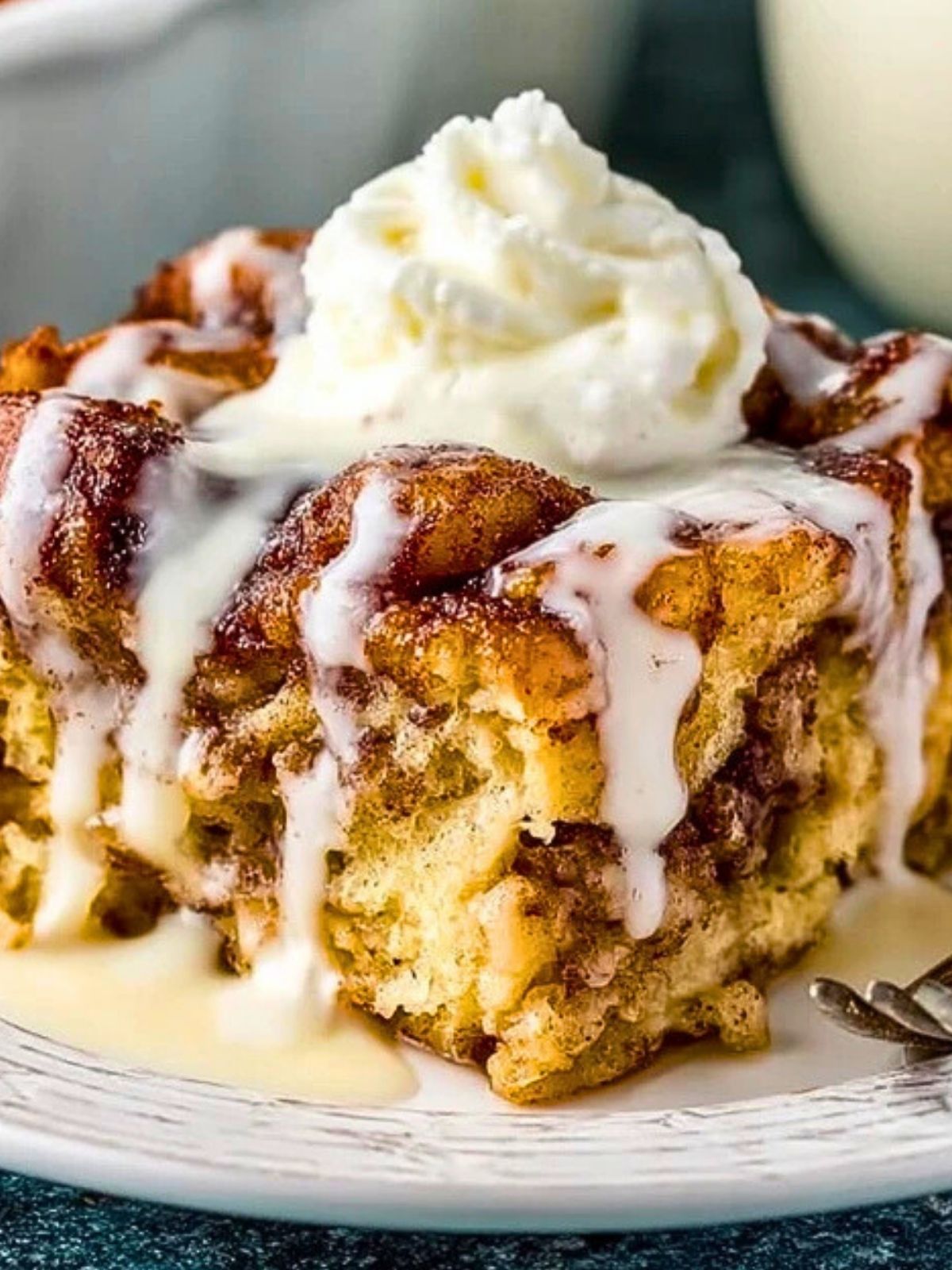 6. Warm the reserved icing from the cinnamon roll package in the microwave for 10–15 seconds and drizzle over the casserole. Optionally top with whipped cream or frosting.