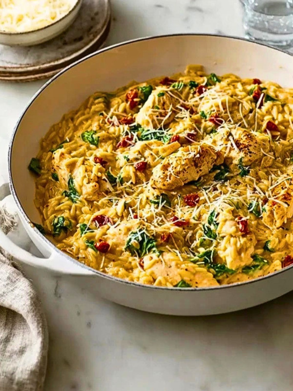 Orzo turns this into a complete one pan meal by soaking up broth and creamy flavor as it cooks.
