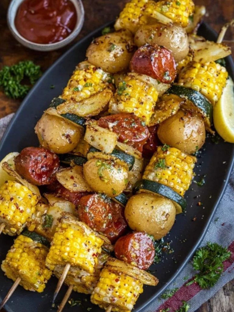 Cowboy Butter Kielbasa and Potato Skewers are a savory, smoky, and buttery grilled favorite packed with juicy sausage, tender potatoes, sweet corn, and vibrant veggies. Each skewer is basted with a zesty cowboy butter that brings bold flavor to every bite—perfect for backyard BBQs, family dinners, or meal-prep nights.
