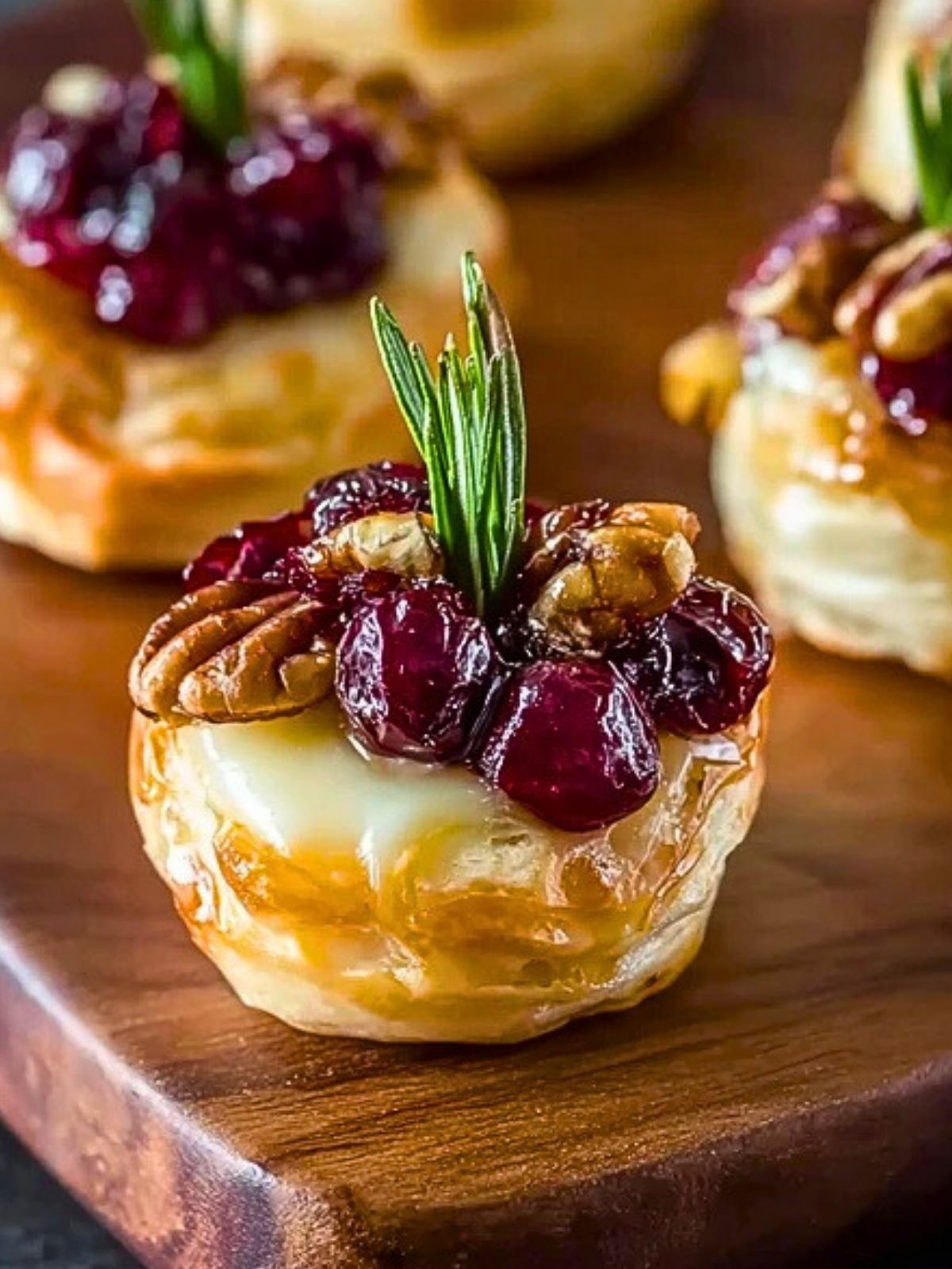 Cranberry Brie Bites are the kind of appetizer that vanishes fast. These festive, savory-sweet morsels are tucked into buttery, golden puff pastry and finished with a sprig of rosemary for a stunning holiday bite. The warm, gooey brie melts perfectly into the pastry cup while the cranberry sauce adds a tart contrast, balanced with crunch from toasted pecans.