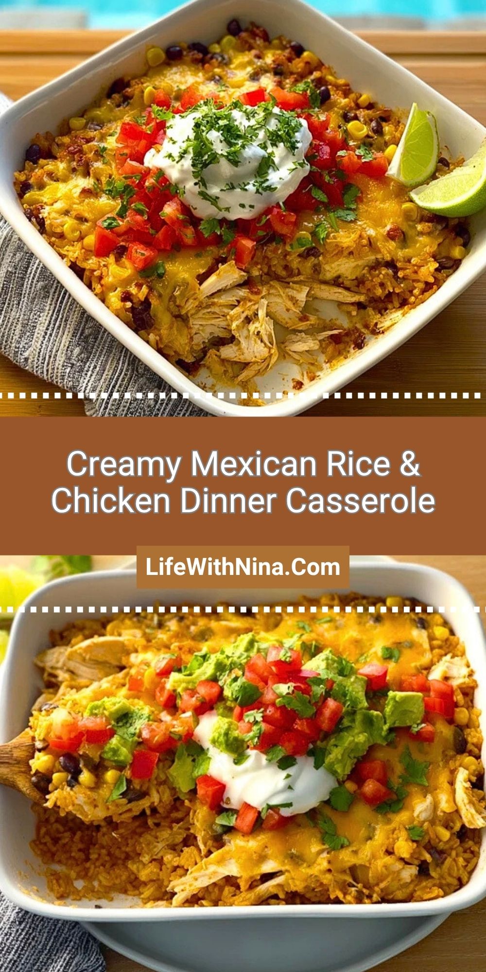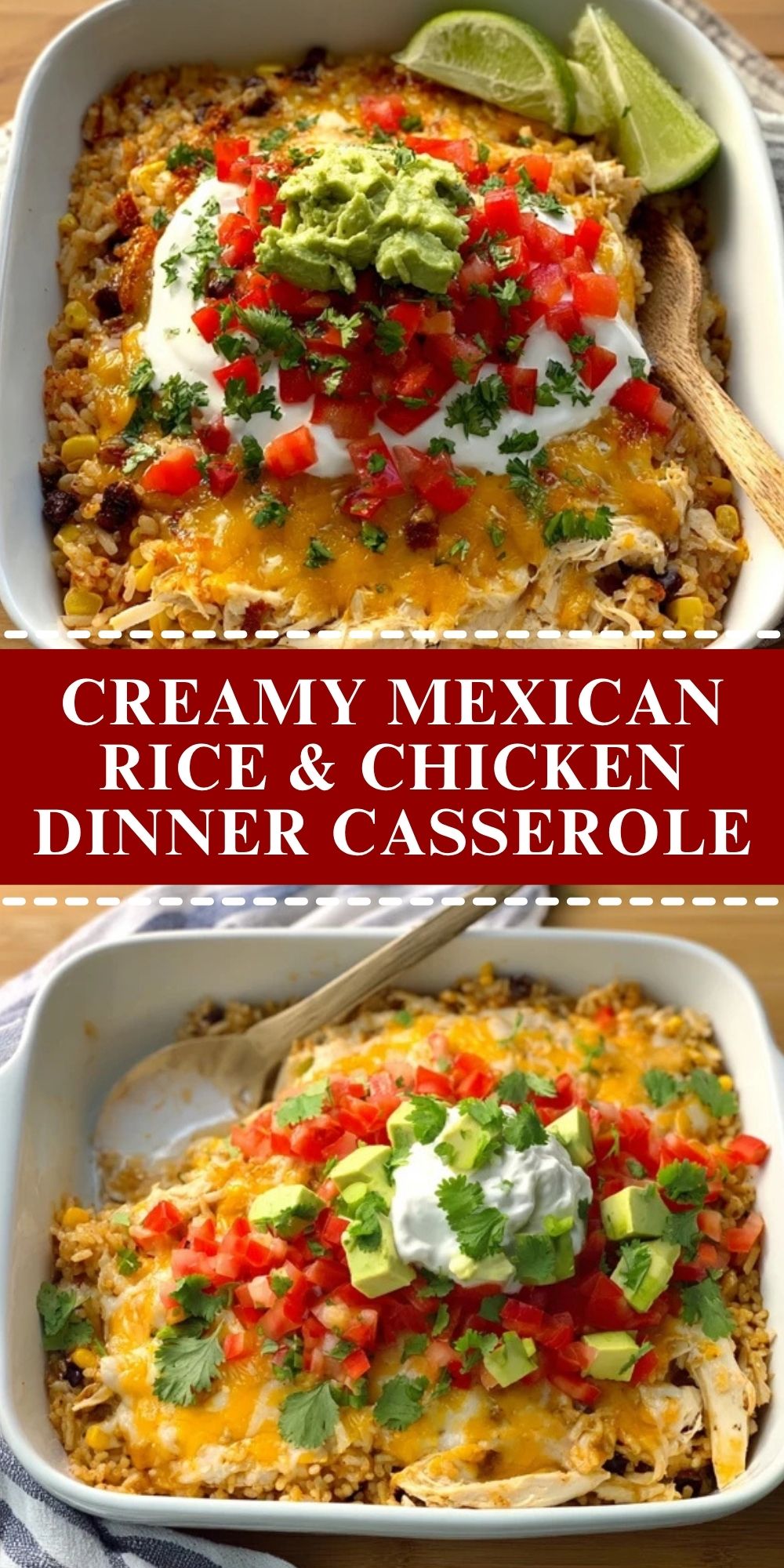 This Creamy Mexican Rice & Chicken Dinner Casserole is a cozy, flavor-packed meal made with shredded chicken, rice, black beans, corn, and a creamy taco-seasoned base. Topped with gooey melted cheese and finished with fresh toppings, it’s the perfect one-dish dinner for family nights or potlucks.