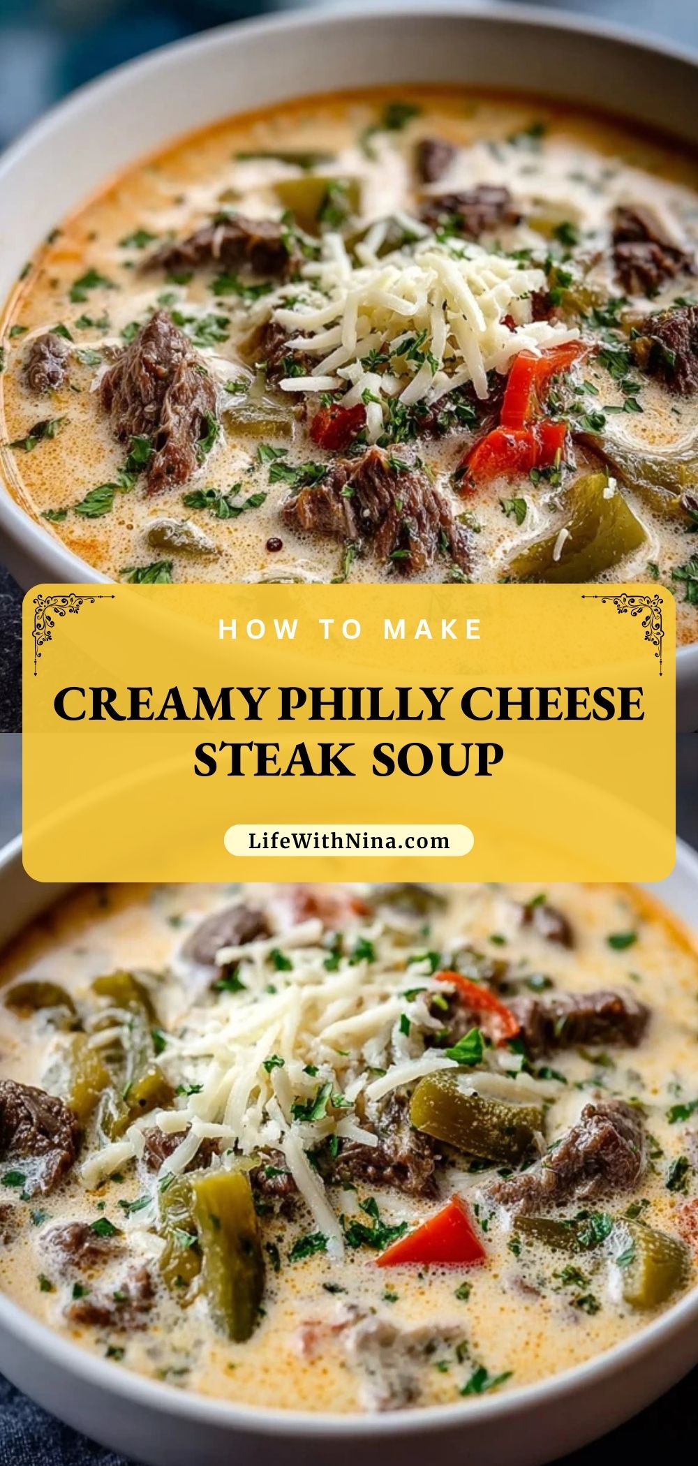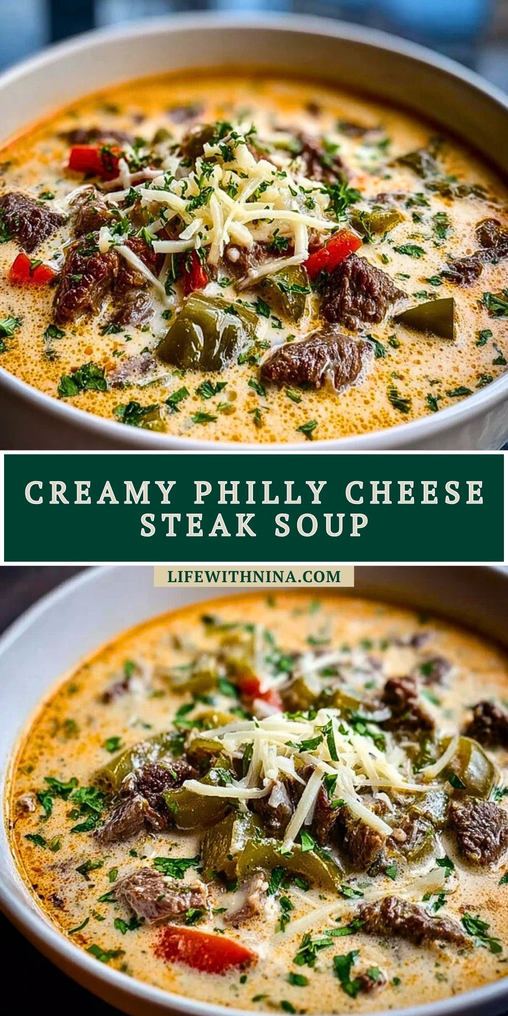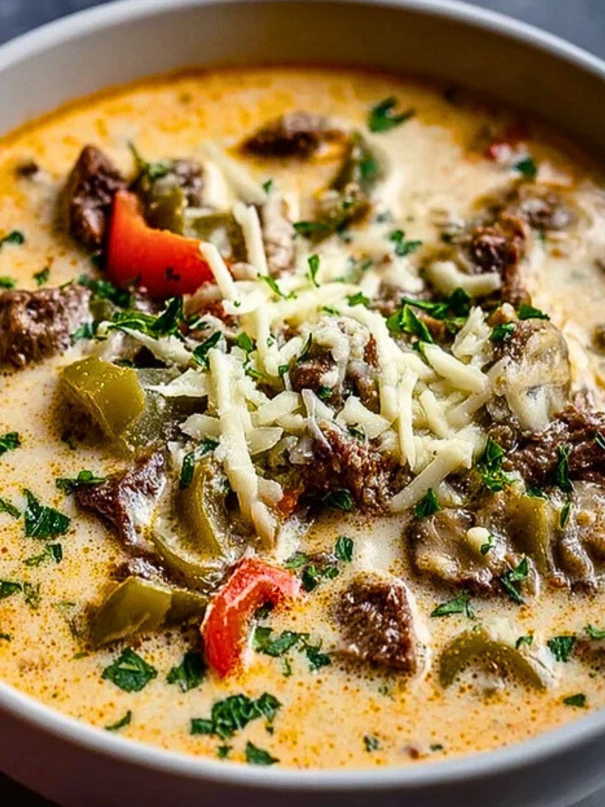 Keywords: Philly cheese steak soup, creamy beef soup, cheesesteak recipe