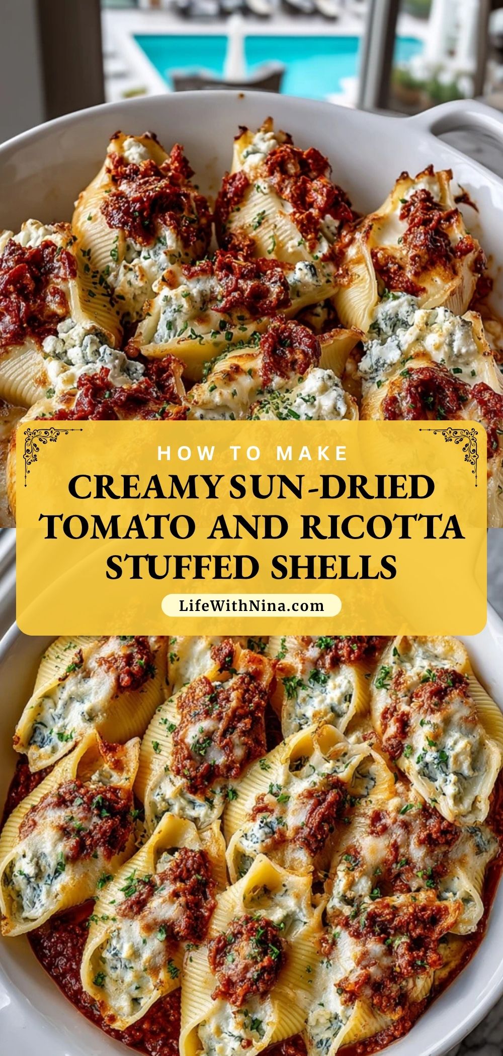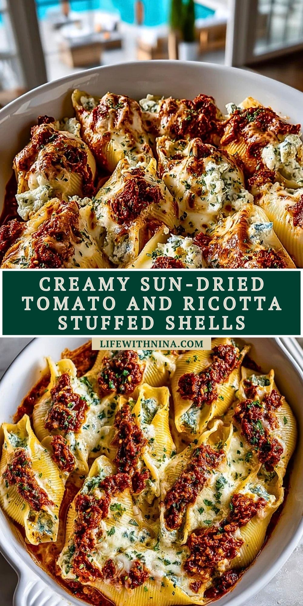 Keywords: creamy sun-dried tomato and ricotta stuffed shells, stuffed shells recipe, baked pasta, easy dinner, dinner ideas, easy recipe, comfort food, cheesy pasta bake