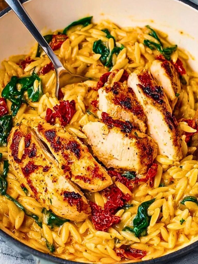 If you’re craving a one-pot wonder that’s loaded with cozy flavors, this Creamy Sun-Dried Tomato Chicken Orzo is a must-try. Perfectly seared chicken rests on a bed of creamy, Parmesan-laced orzo pasta, swirled with tangy sun-dried tomatoes and fresh baby spinach. The sauce is luscious and garlicky, coating every grain of orzo with rich flavor.
