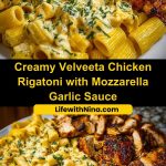 Keywords: creamy chicken pasta, Velveeta rigatoni, mozzarella garlic sauce