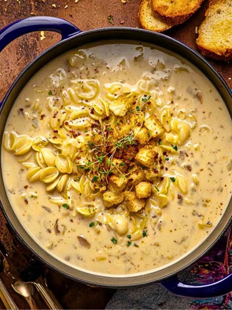 Keywords: creamy soup, mushroom soup, vegetarian pasta soup