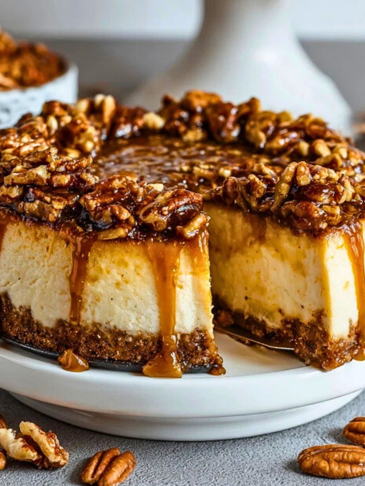 Serve this cheesecake chilled for the best texture and flavor. It slices beautifully when cold, and each wedge showcases the stunning layers of crust, creamy filling, and glossy pecan topping.