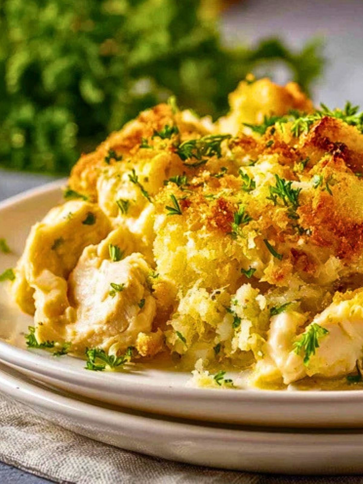 Let the casserole sit for about 5 to 10 minutes before serving. Finish with chopped parsley for a fresh, colorful touch.