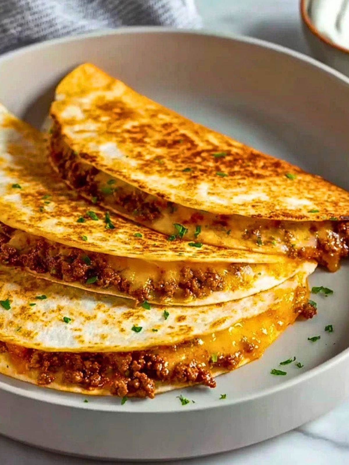 Serve the quesadillas warm with sour cream, salsa, guacamole, or your favorite toppings. A sprinkle of parsley or cilantro on top adds a fresh finish.