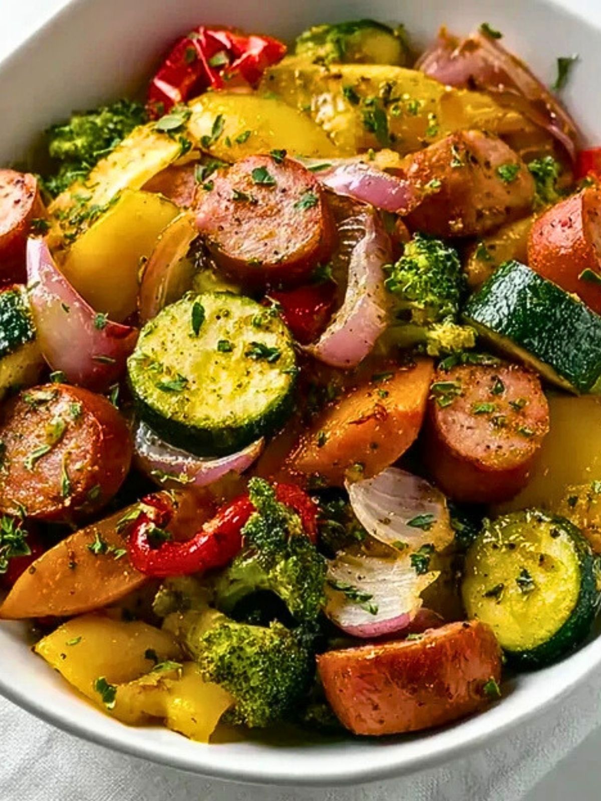 With smoky chicken sausage rounds, vibrant roasted vegetables like zucchini, peppers, and broccoli, and a sprinkle of herbs, this recipe delivers comfort and nutrition in every bite. Whether you’re cooking for one or feeding a hungry family, this dish is a fuss-free favorite that checks all the boxes.