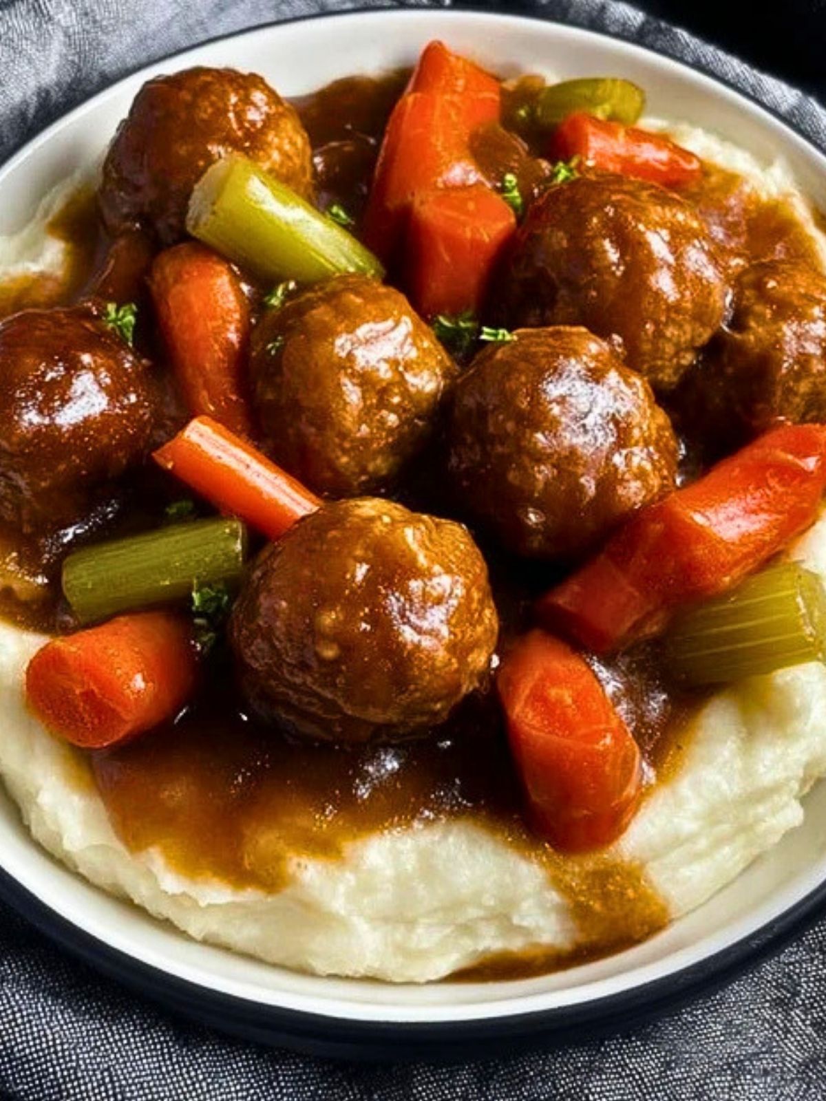 Spoon the meatballs, vegetables, and gravy over a generous portion of mashed potatoes. Serve warm and enjoy the comforting flavors.