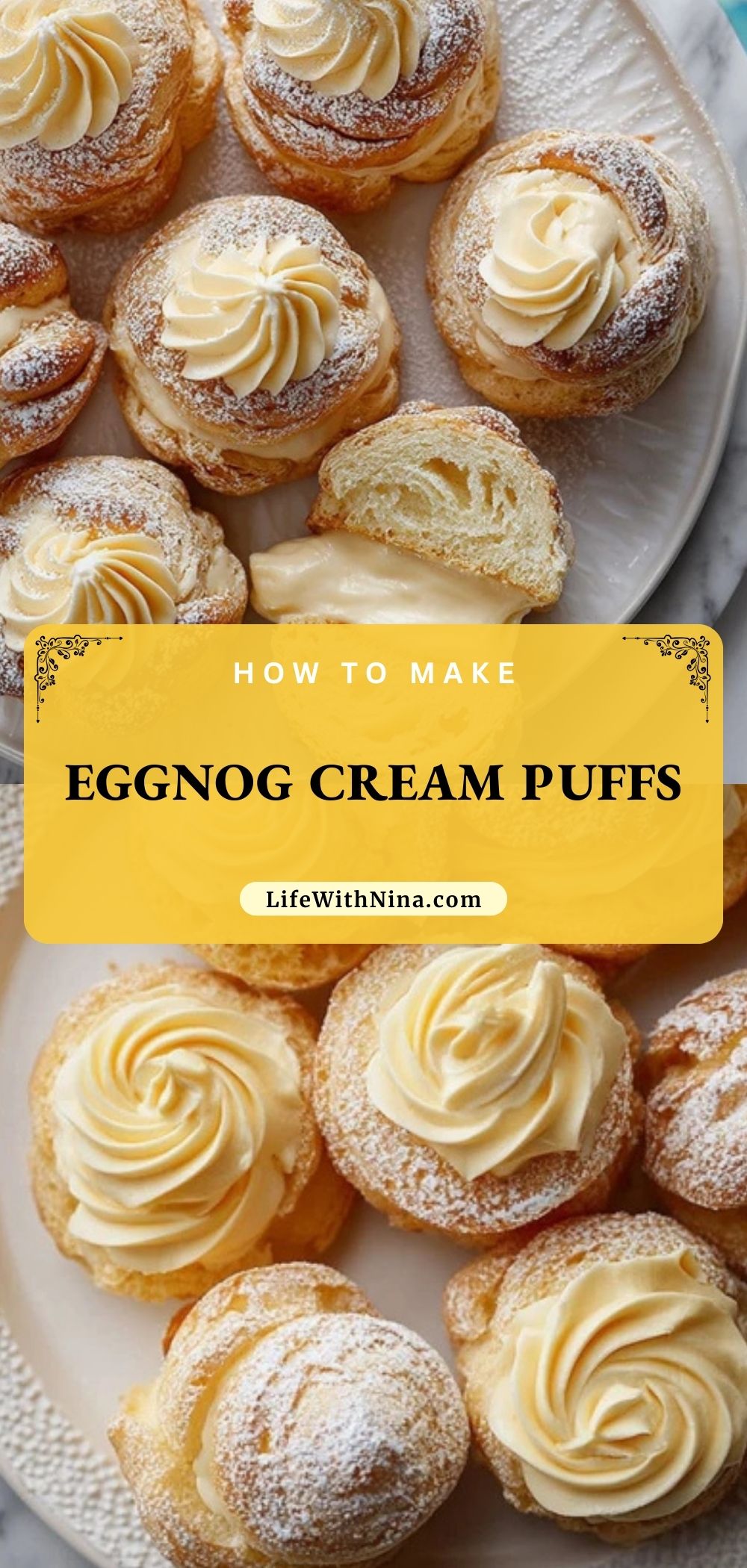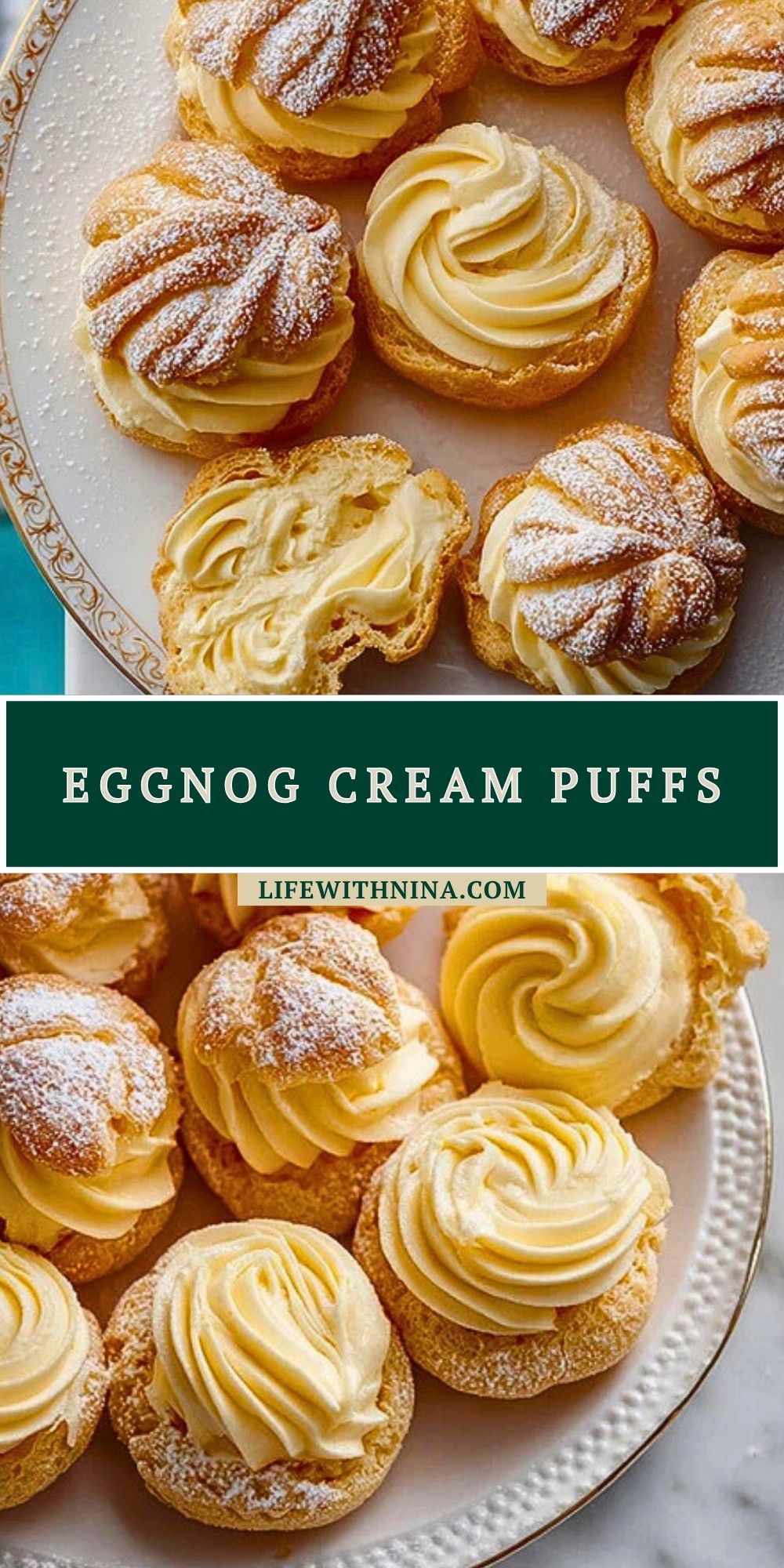 12. Cut puffs in half, fill the bottoms with eggnog cream, and replace tops. Dust with powdered sugar before serving if desired.
