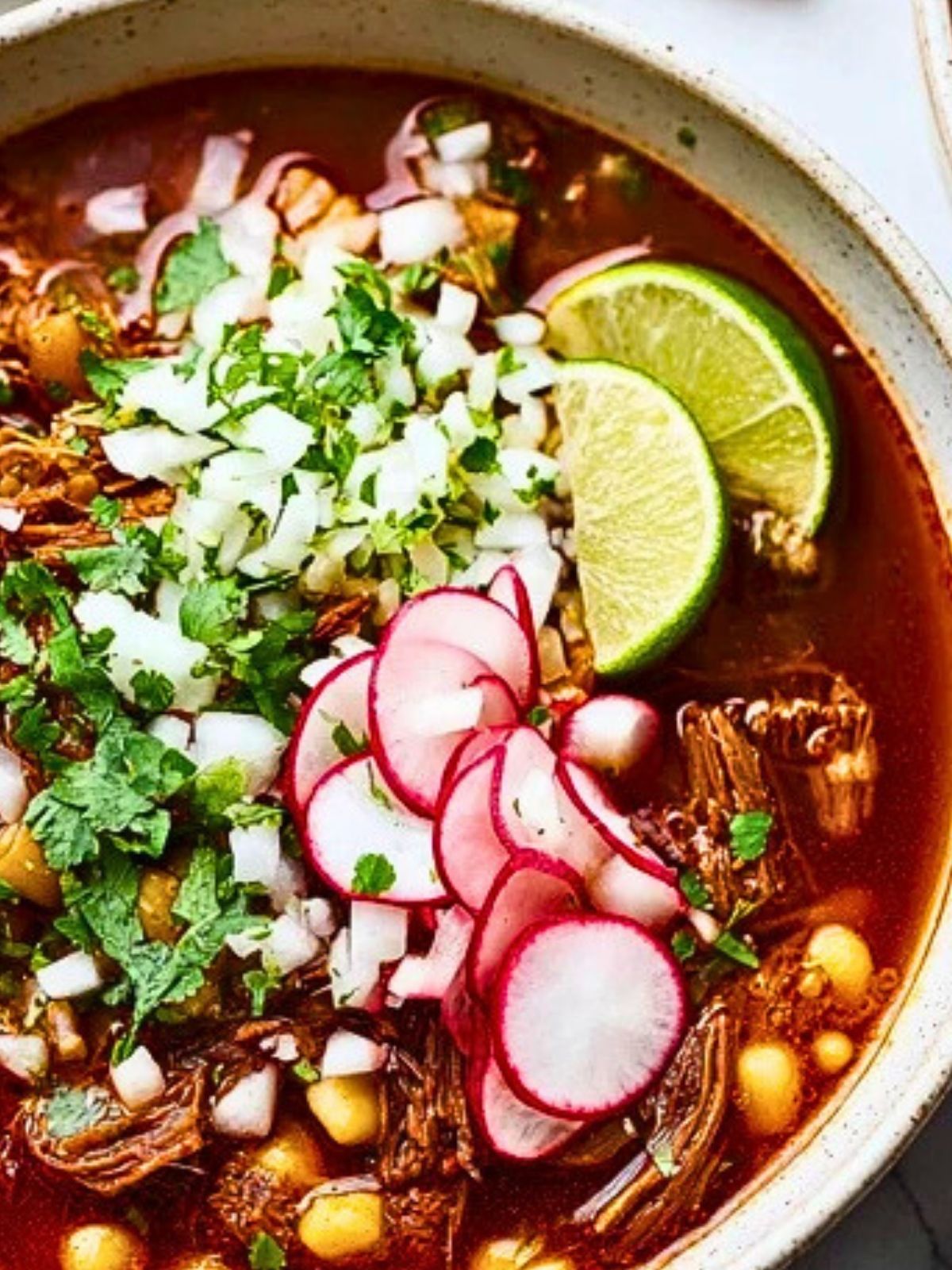 A traditional Mexican stew made with tender pork, a rich red chile broth, and chewy hominy. This comforting dish is topped with crisp radishes, cabbage, onion, lime, and cilantro for the perfect balance of warm, spicy, and fresh flavors. Great for gatherings or a flavorful meal prep option.