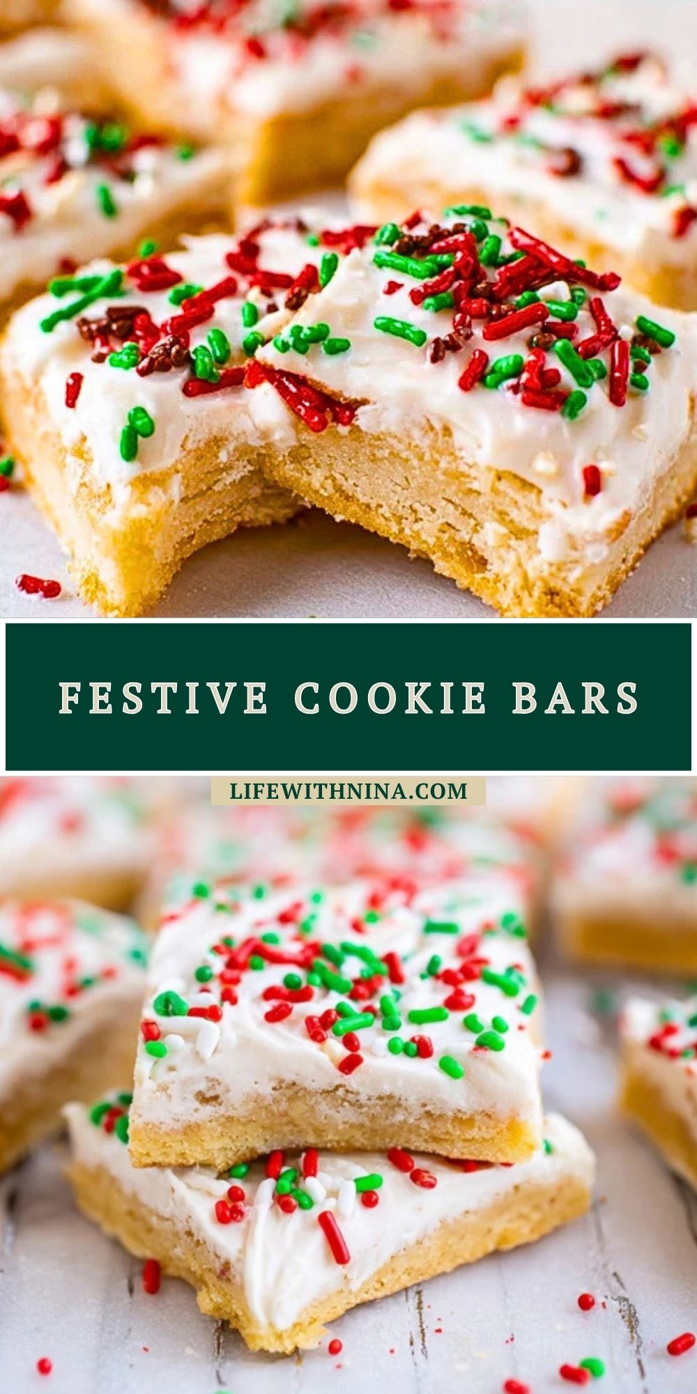 Spread the frosting evenly over the cooled cookie bars. Finish with a generous amount of red and green sprinkles.