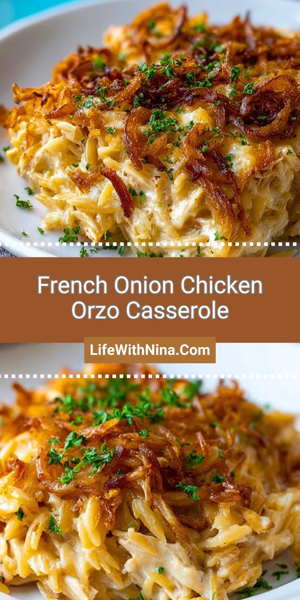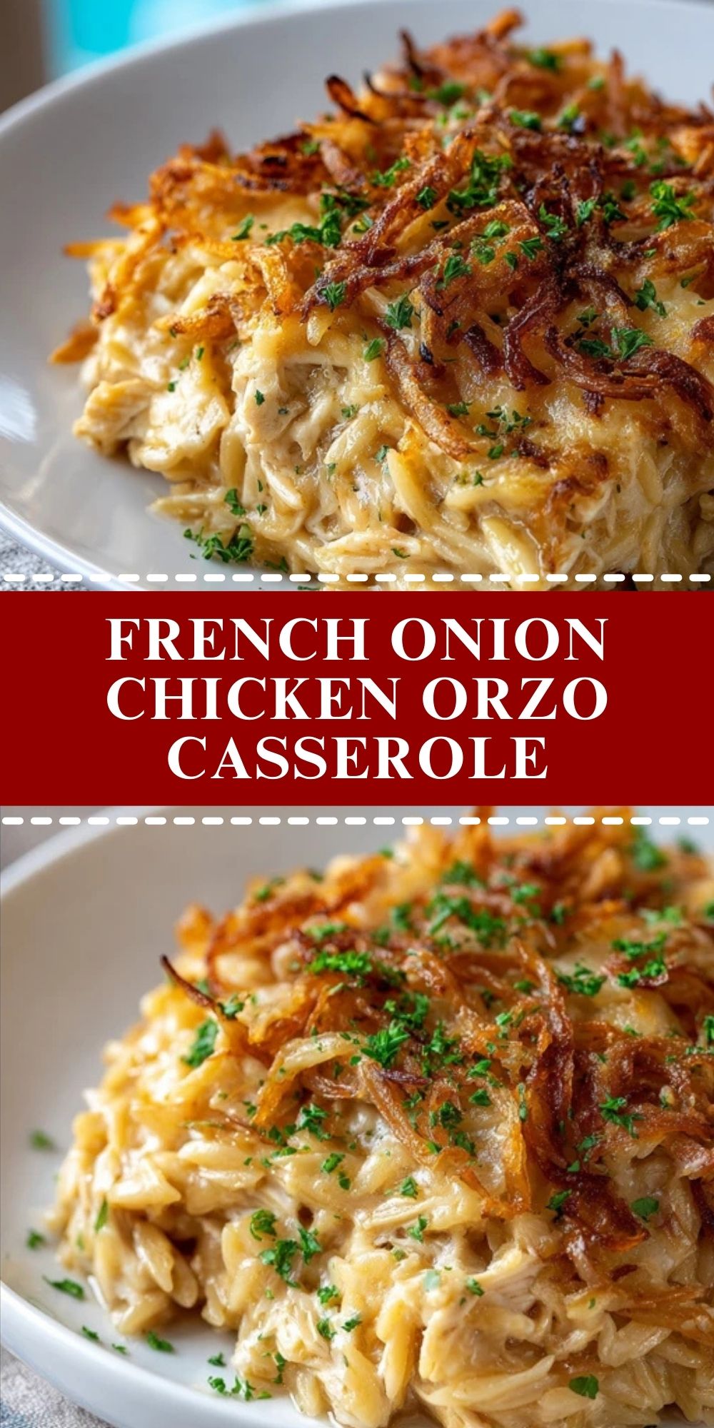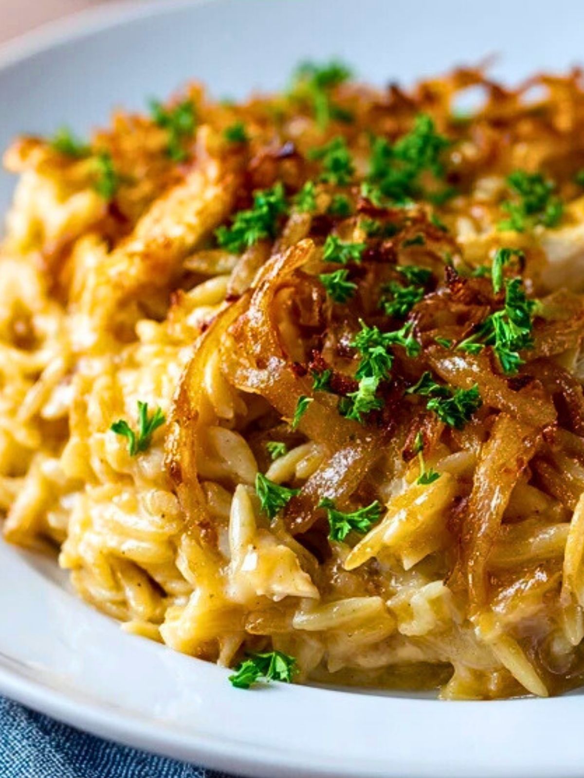 Keywords: French onion, chicken casserole, creamy orzo, comfort food