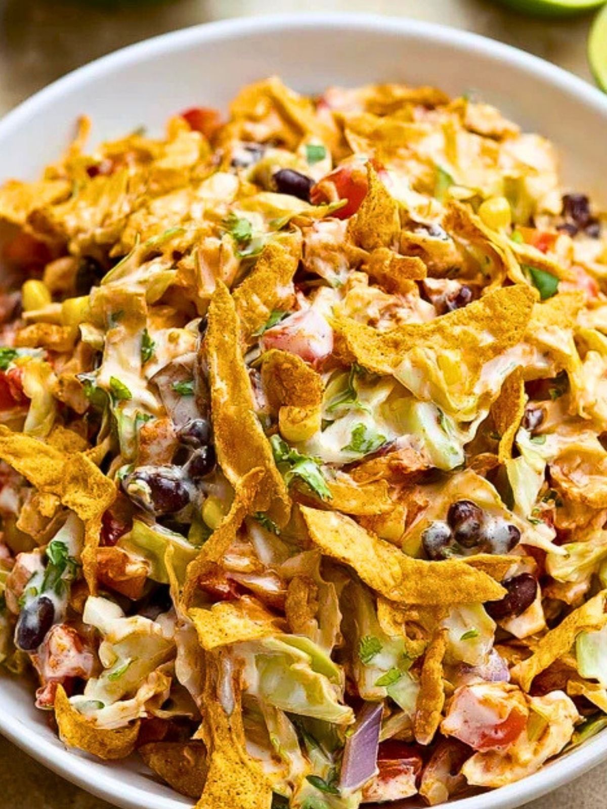 What really makes this dish stand out is the contrast in textures and flavors. You get crisp cabbage, juicy tomatoes, creamy dressing, and bold corn chip crunch in every bite. With black beans and sweet corn folded in, it becomes hearty enough to serve as a full meal while still feeling fresh and vibrant.
