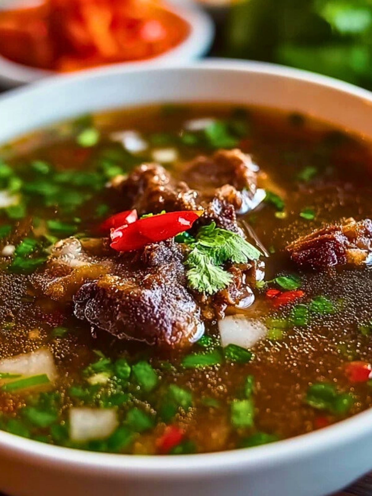 Once the soup is ready, skim off any fat from the surface. Ladle into bowls and top with freshly chopped green onions and cilantro. Optionally, add a dash of sesame oil or red chili for heat.