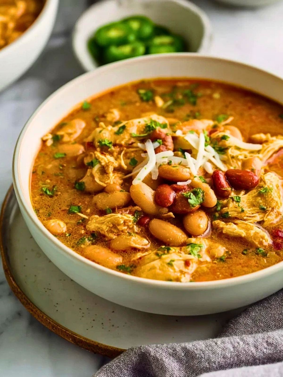 What makes this chili especially craveable is the balance of flavors. You get the deep savoriness of broth and chicken, the creamy texture from beans and dairy, and a bright finish from fresh toppings like cilantro, jalapeños, and shredded cheese. It is an easy dinner idea for busy nights, game days, weekend meal prep, or anytime you want a hearty bowl of comfort food.