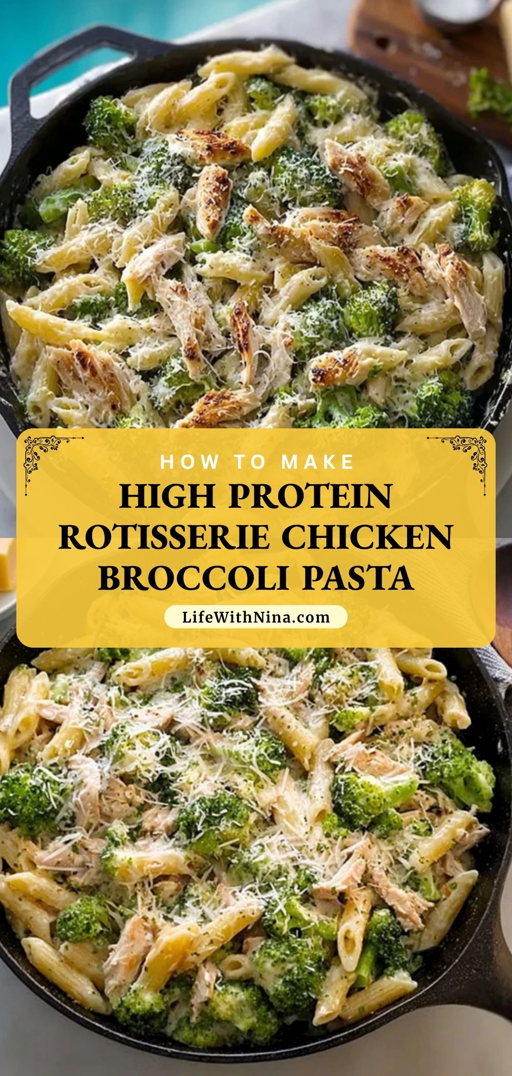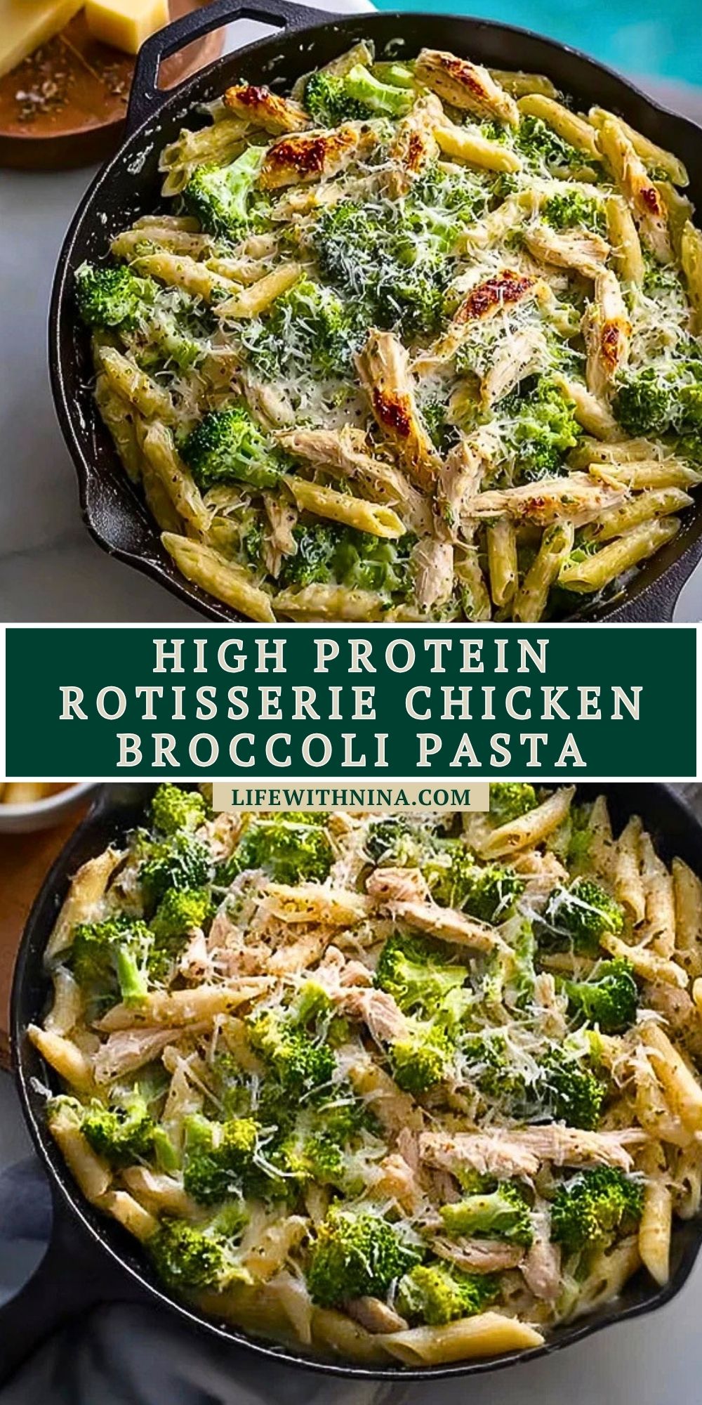 Keywords: high protein rotisserie chicken broccoli pasta, chicken broccoli pasta, easy dinner, quick dinner, high protein pasta, meal prep, family dinner, pasta recipe
