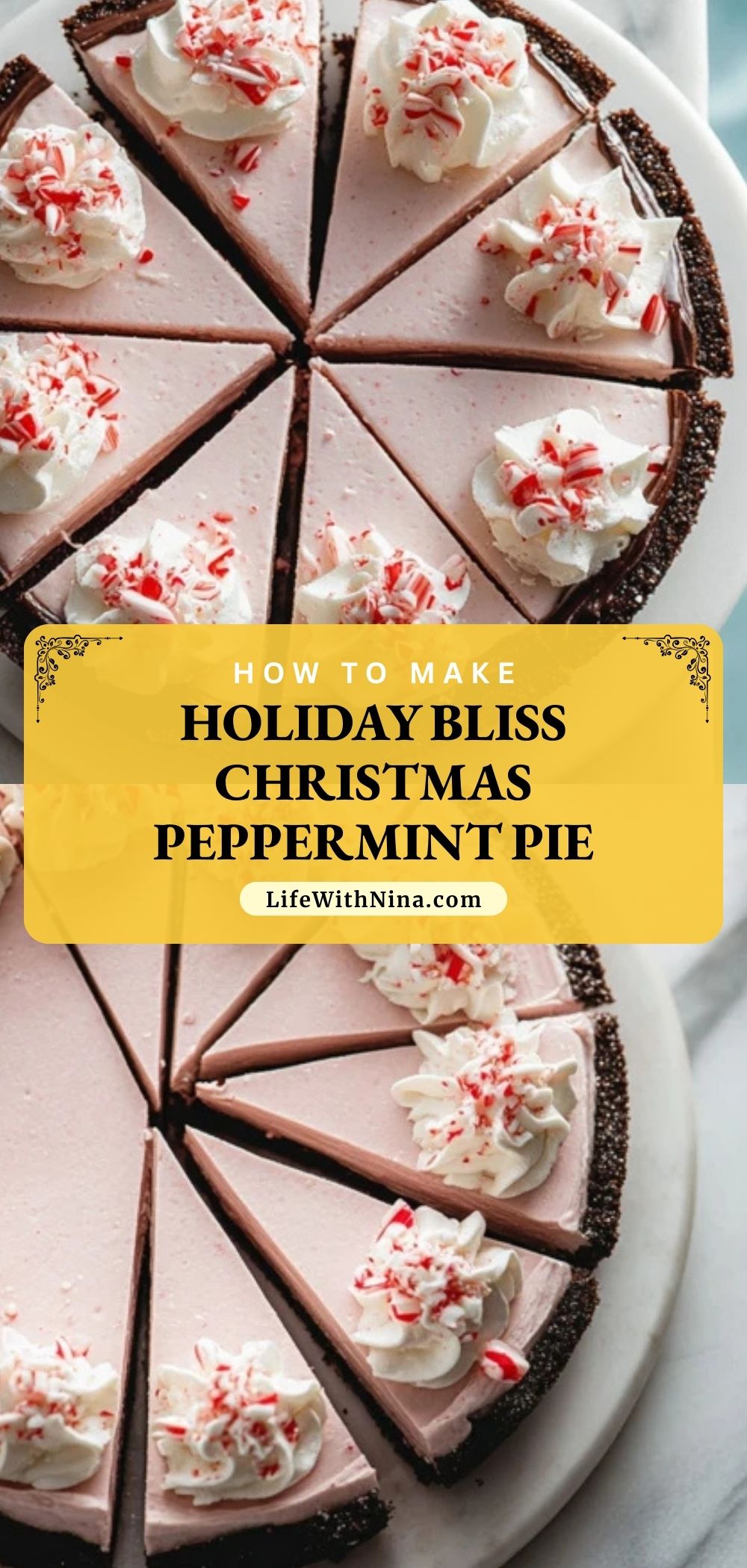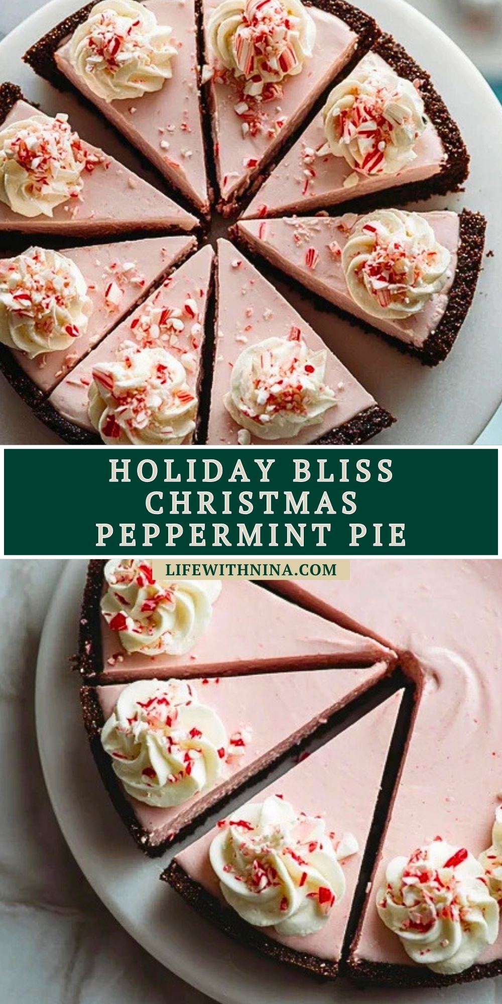 This no-bake Holiday Bliss Christmas Peppermint Pie features a creamy peppermint filling over a chocolate cookie crust, topped with fluffy whipped cream and crushed peppermint candies. A festive, make-ahead dessert perfect for Christmas gatherings or cozy winter nights.