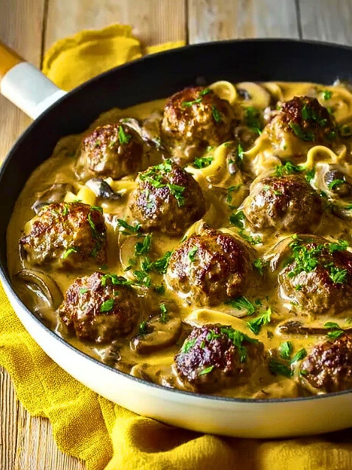 This dish is best served warm, straight from the skillet over a bed of buttery egg noodles or mashed potatoes. If you want a low-carb option, try spooning the creamy meatballs over cauliflower mash or zucchini ribbons.
