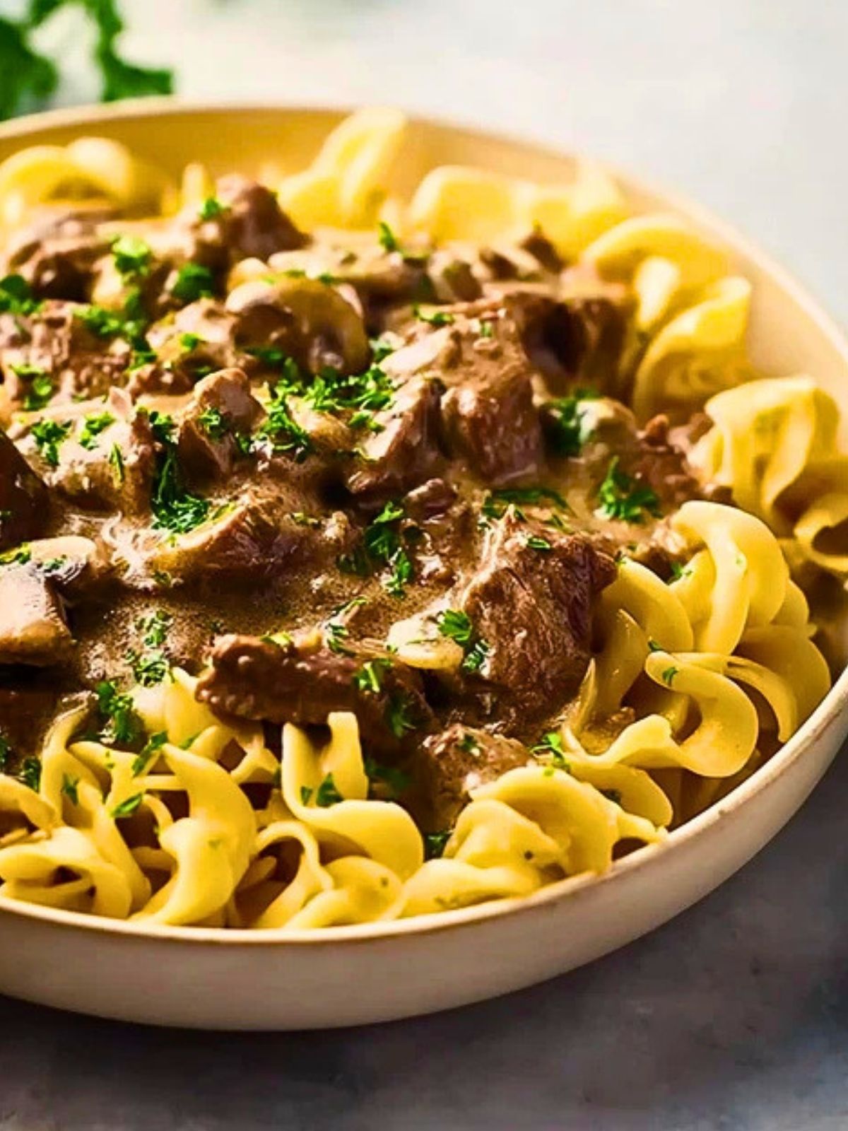 Spoon the stroganoff into bowls and top with chopped fresh parsley. Serve it hot for the ultimate comfort food dinner.