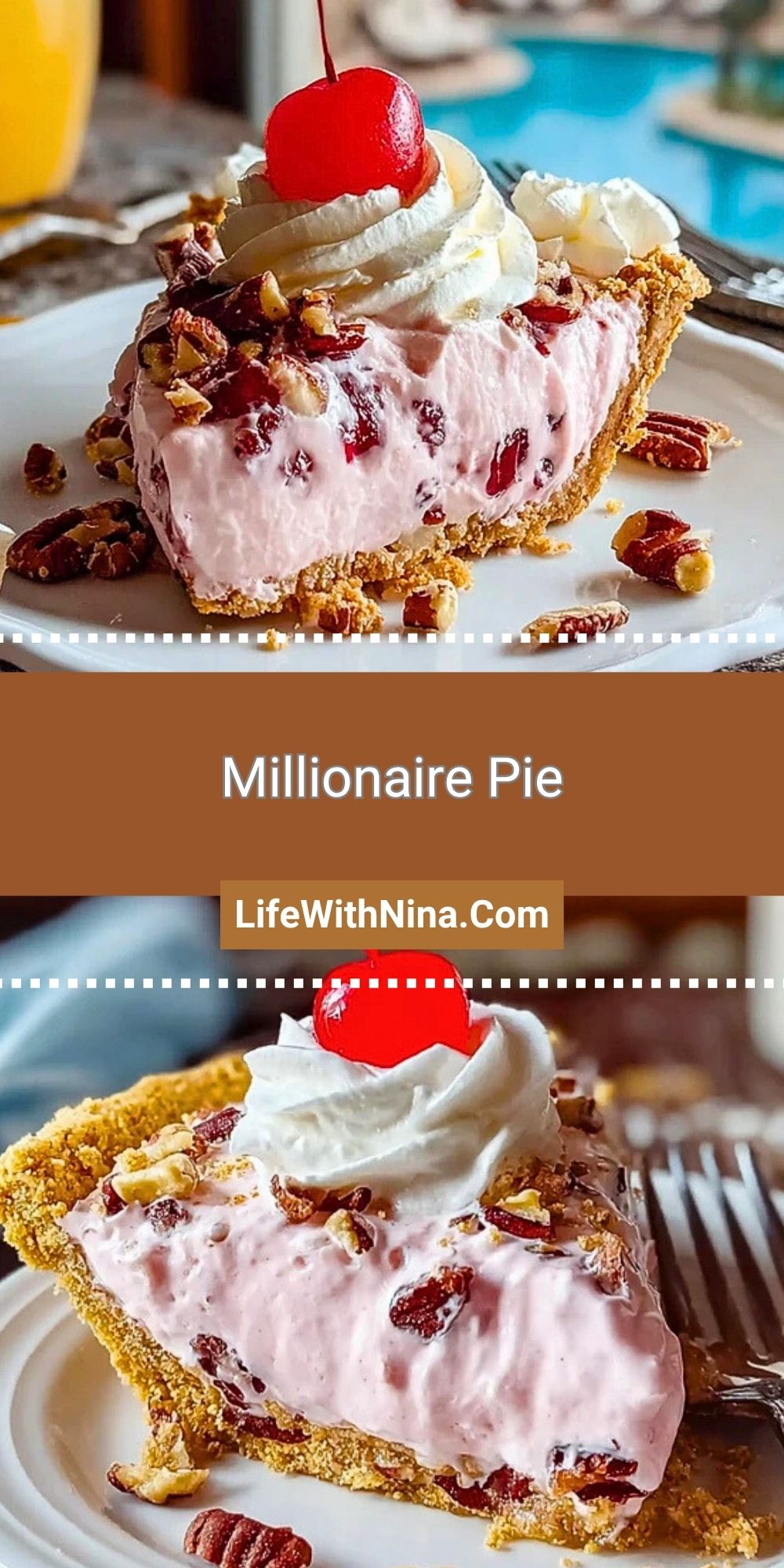 Millionaire Pie is a dreamy, no-bake dessert with a creamy filling of whipped topping, crushed pineapple, and sweetened condensed milk in a buttery graham cracker crust. Topped with pecans and cherries, it’s a refreshingly easy treat that’s rich, fruity, and irresistibly nostalgic.