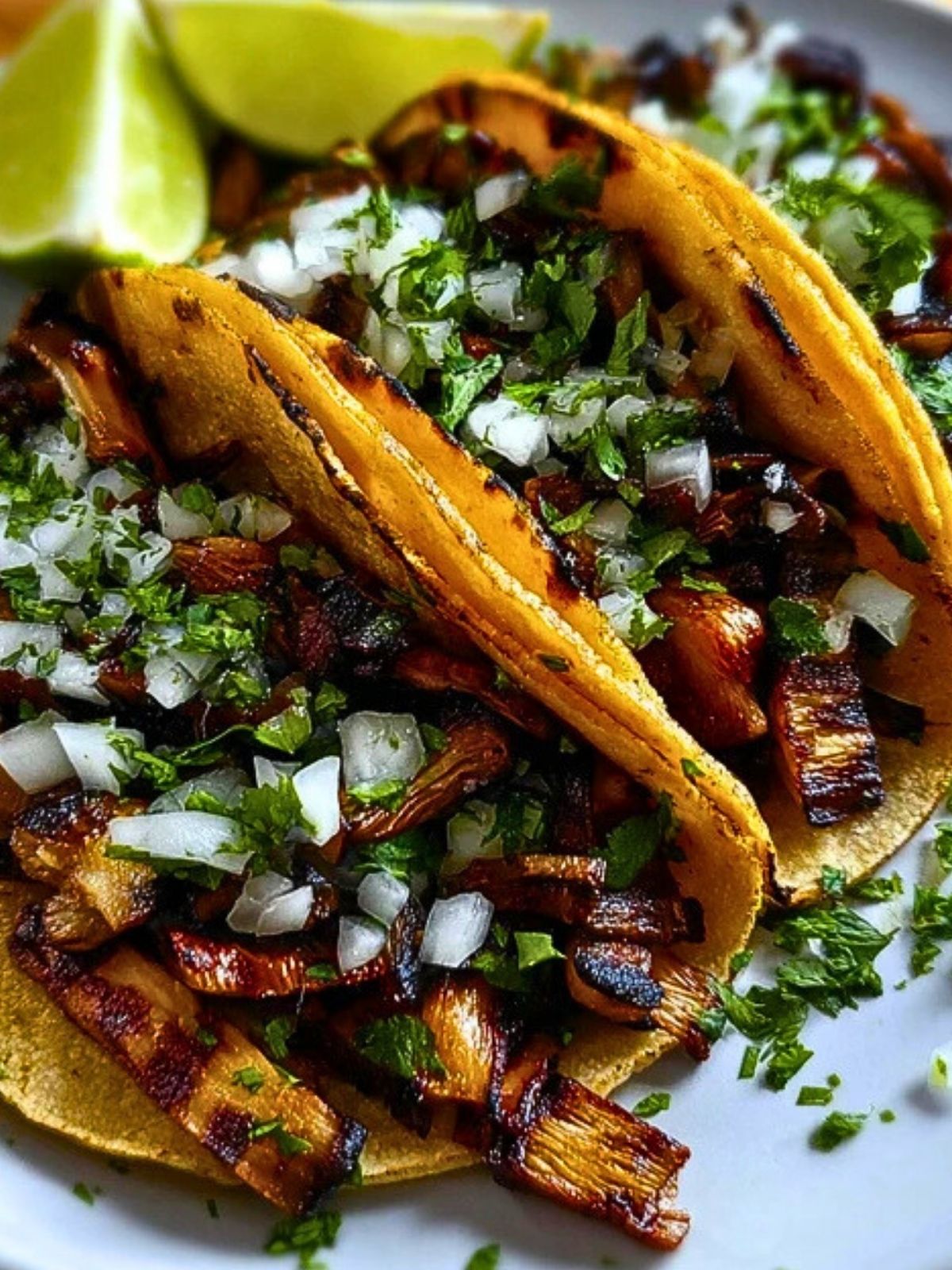 These tacos are best served immediately while the mushrooms are still hot and slightly crispy. Serve them family-style with bowls of chopped onion, cilantro, and lime wedges on the side so everyone can customize their own tacos. They also pair perfectly with a chilled hibiscus tea, a scoop of guacamole, or even a smoky salsa for extra heat.