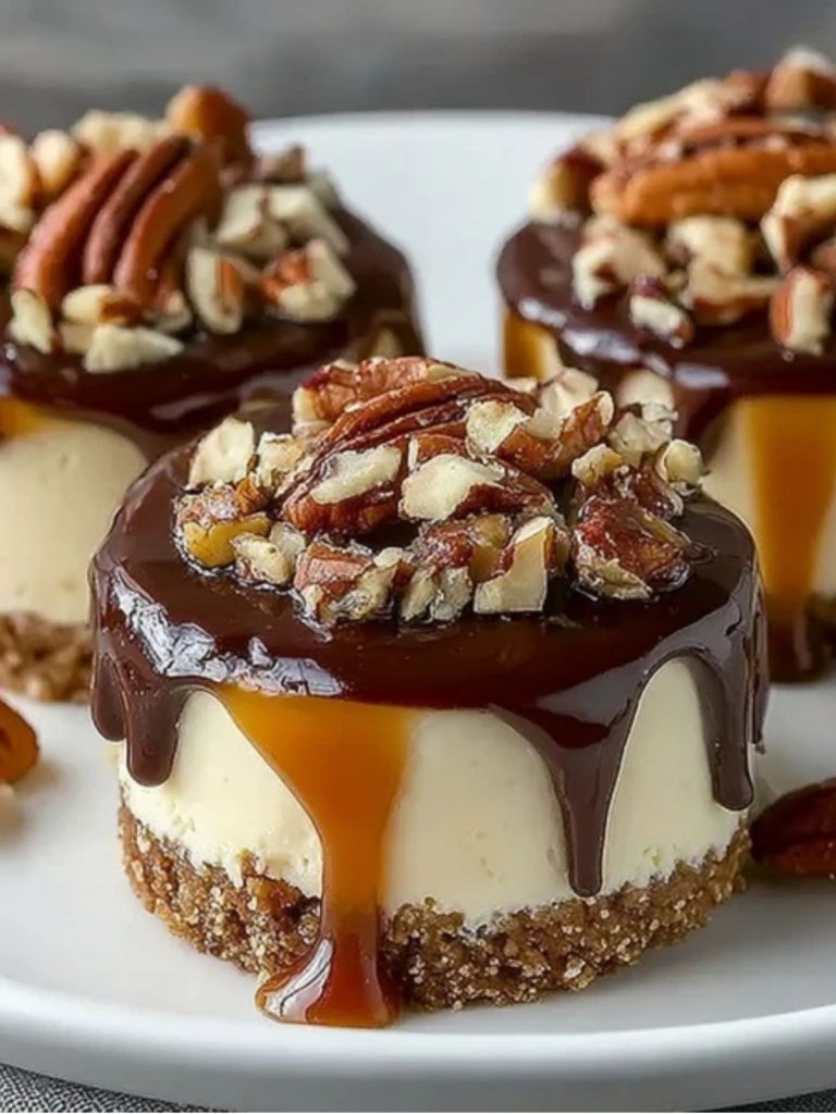 These No Bake Turtle Mini Cheesecakes combine a nutty graham-pecan crust, silky cream cheese filling, rich chocolate ganache, gooey caramel, and crunchy pecans—all in one chilled, bite-sized treat. They’re perfect for parties, holidays, or whenever your sweet tooth strikes. No baking required!
