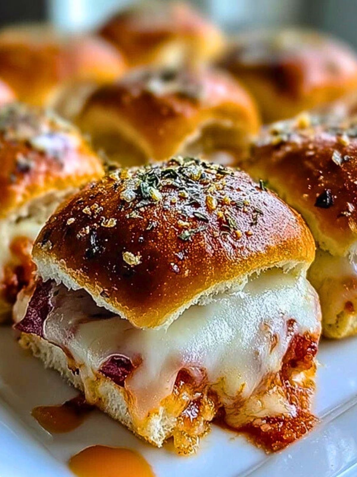 Pizza Sliders are best served warm, right out of the oven when the cheese is still melty and the tops are crisped to golden perfection. They make the ultimate game day snack, casual dinner, or party appetizer. Pair them with extra marinara sauce for dipping, a crisp Caesar salad, or even garlic knots to round out the pizza-night vibe.