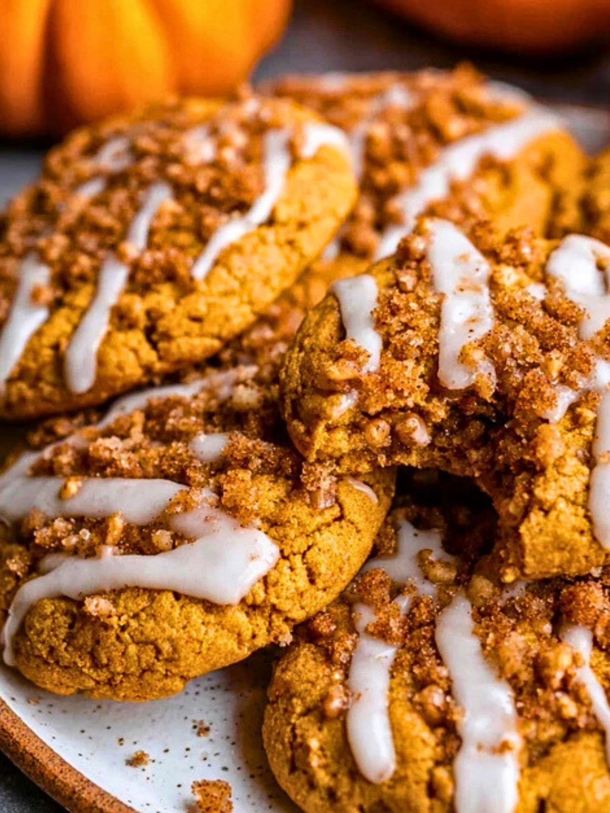 These Pumpkin Coffee Cake Cookies are soft, spiced, and topped with buttery streusel and a silky vanilla glaze—bringing all the cozy flavors of fall into one delicious bite-sized treat.