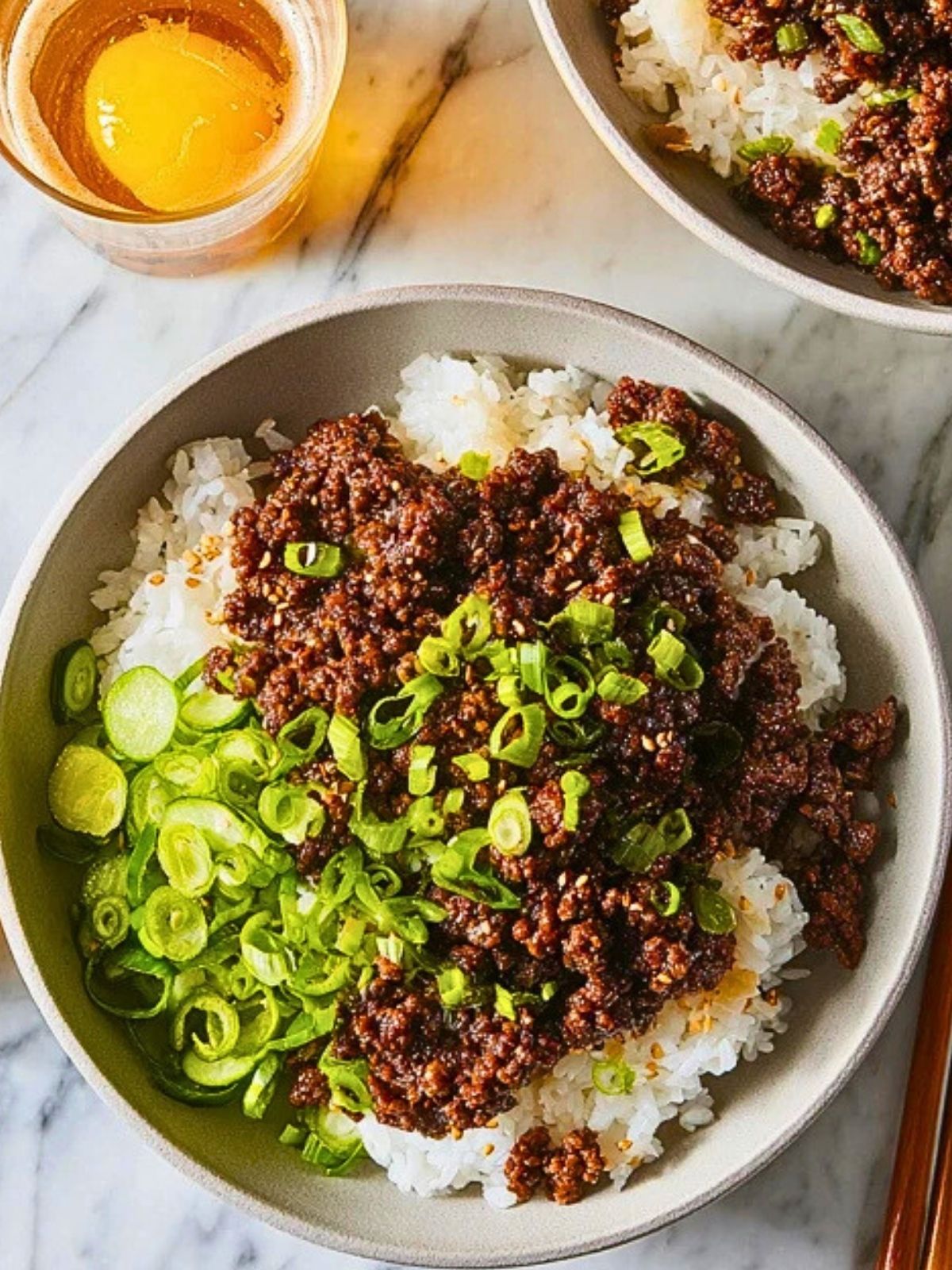 5. Assemble the bowl by placing rice in a bowl, topping with the beef mixture and chopped green onions.