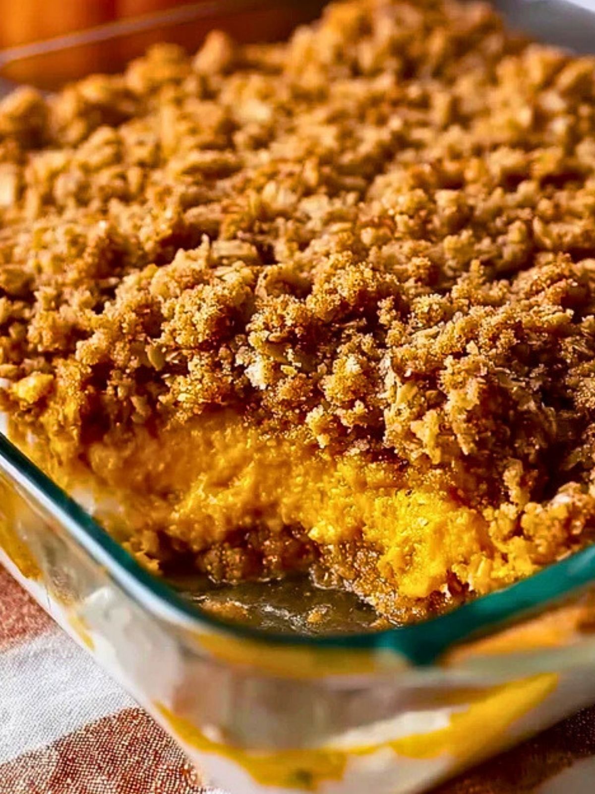 Think of it as the cousin of pumpkin pie and apple crisp. The smooth custard-like base brings all the flavors of classic pumpkin pie, while the crisp oat topping adds a satisfying crunch in every bite. It’s a crowd-pleaser, best served warm with a scoop of vanilla ice cream or a dollop of whipped cream.