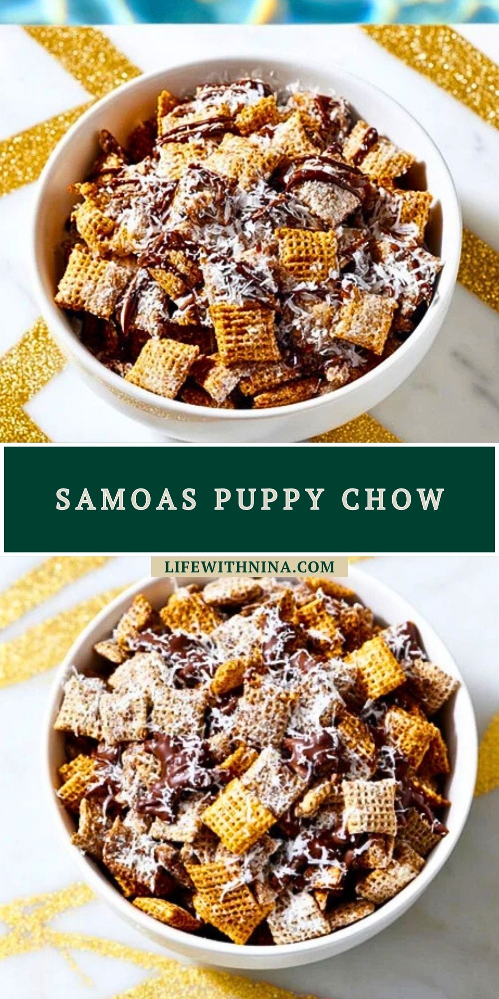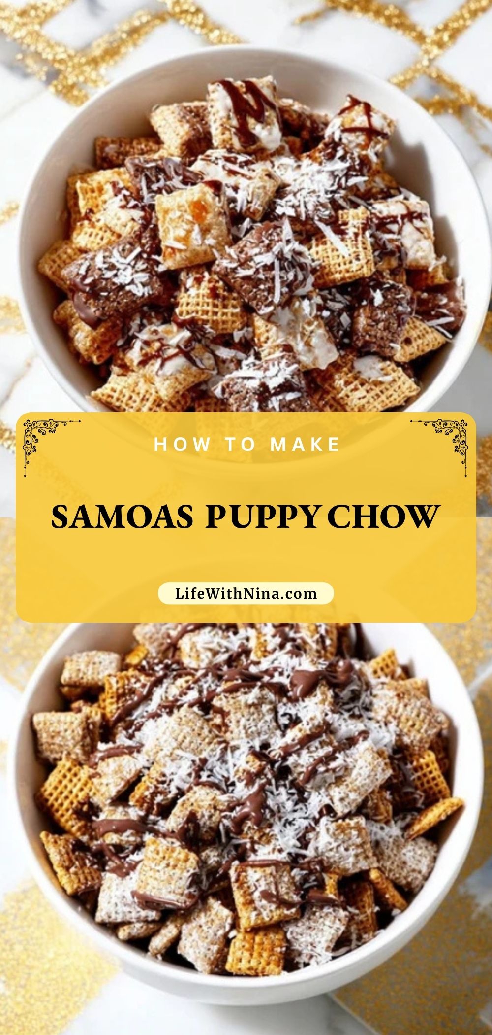 Keywords: Samoas Puppy Chow, no-bake snack mix, caramel coconut chocolate
