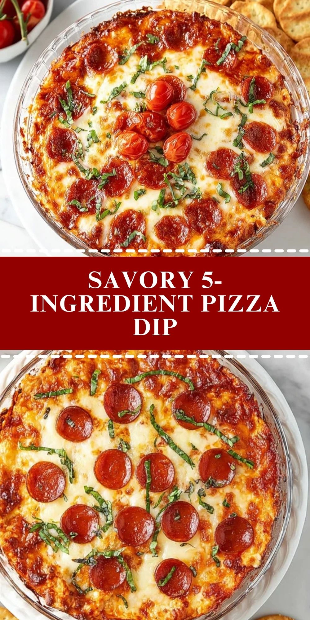 When it comes to party snacks or effortless game day appetizers, this Savory 5-Ingredient Pizza Dip absolutely steals the show. It brings all the cheesy, melty goodness of your favorite pizza into a scoopable, crowd-pleasing form. Rich cream cheese forms the base, layered with zesty pizza sauce, gooey mozzarella, and savory pepperoni, then finished with a sprinkle of fresh basil. It’s the kind of dip that disappears fast—so double it if you’re serving a crowd!